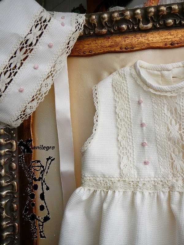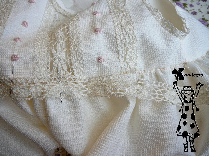 Lo confeccioné en un piqué clásico de cuadradillo , y lo adorné con puntilla de hilo , similares a los trabajos de bolillo , para darle ese aire como de muñequita antigua