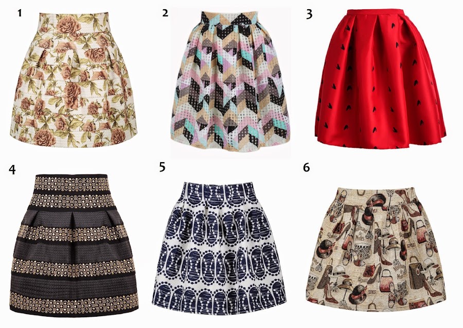 1- Falda estampado flores AQUÍ, 2- Falda multicolor AQUÍ, 3- Falda roja estampado ranas AQUÍ, 4- Falda tachuelas AQUÍ, 5- Falda círculos AQUÍ, 6- Falda estampado moda AQUÍ.