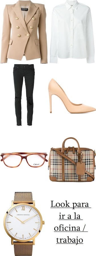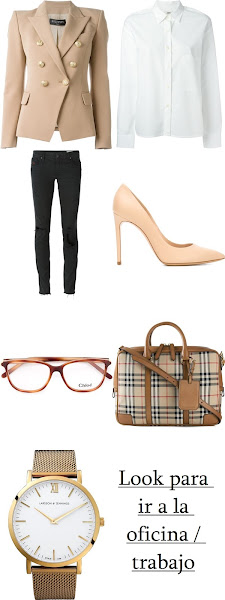 Un look formal para ir a la oficina / trabajo en la que opto por tonos nude como la blazer, zapatos, gafas y maletín conjuntado con jeans en negro y camisa básica blanca.