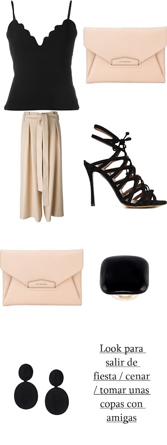 Y un último look para salir de fiesta /cenar / tomar una copas con nuestro chico o amigas optando por una falda-pantalón en color maquillaje a juego con el clutch, combinado con el resto de prendas y complementos en negro.Espero que os gustase. Besitos y feliz día!!!