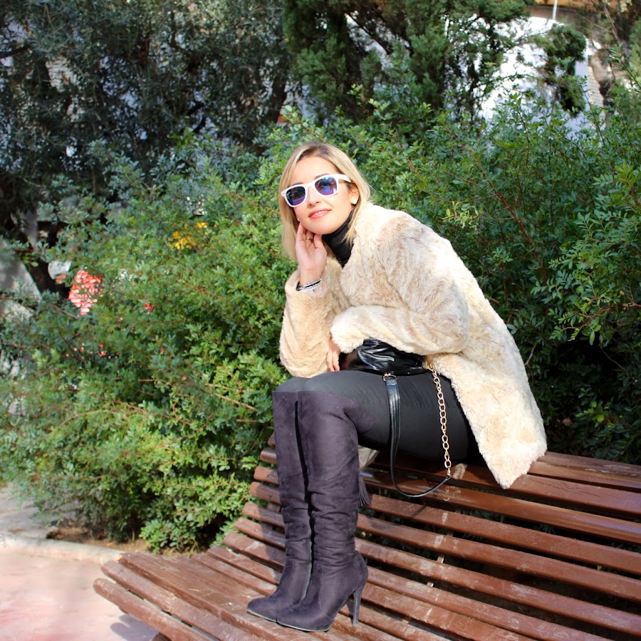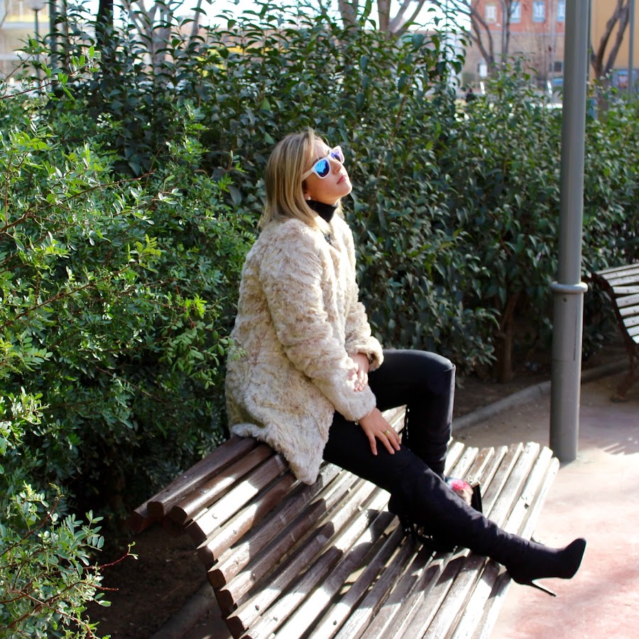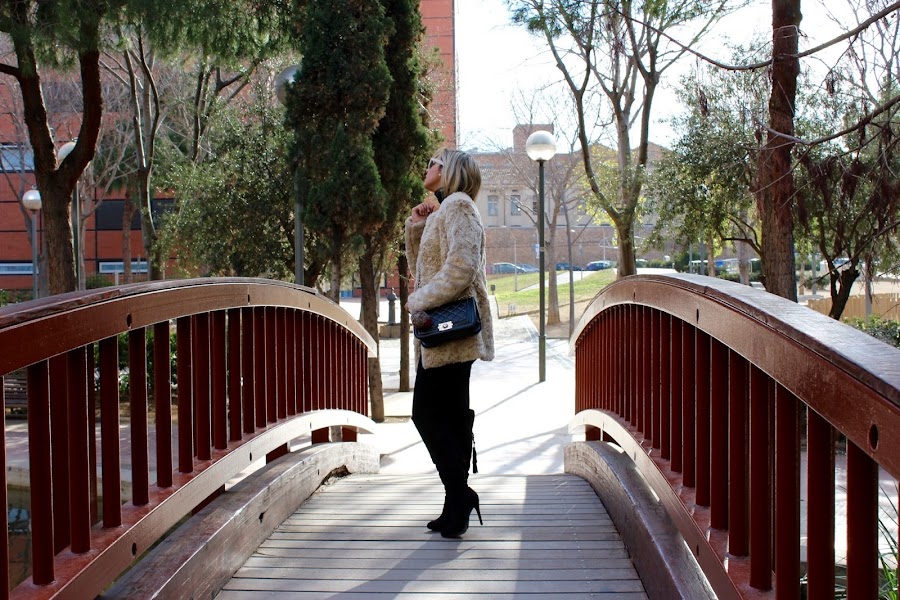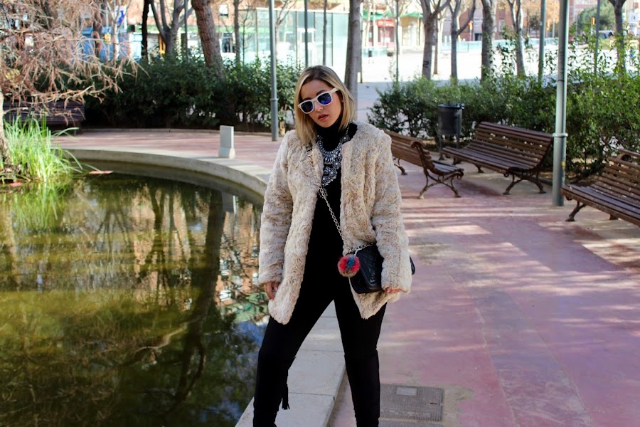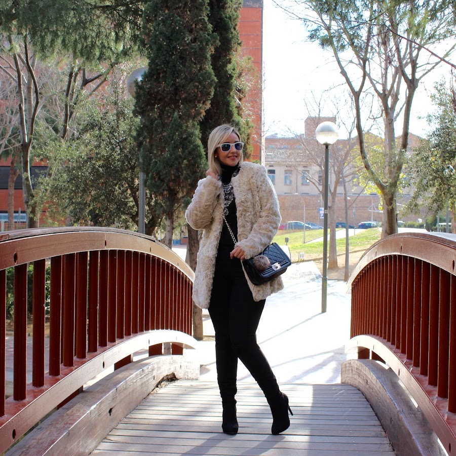 Hoy os traigo un look donde el protagonista es mi abrigo de pelo, que este año casi no he usado porque no ha hecho mucho frío. Lo combiné en un total look en negro para darle más protagonismo. Los accesorios del look mis botas por encima de la rodilla, mi collar boho y mi bolso estilo chanel.