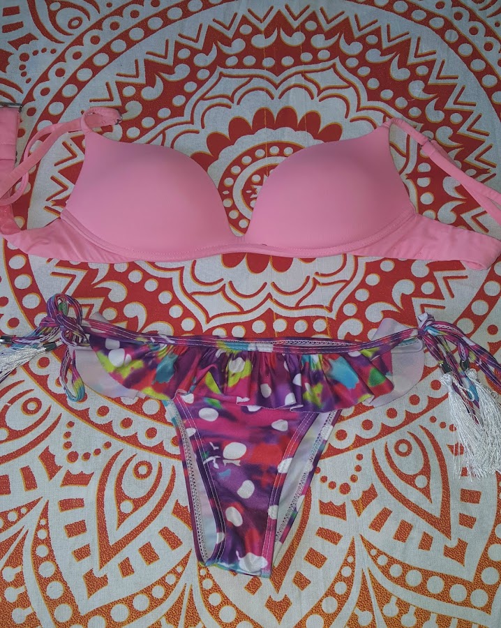 En este caso la parte de arriba es una básica de Calcedonia en rosa chicle que me encanta, y la parte de abajo es una braguita brasileña de aliexpress.