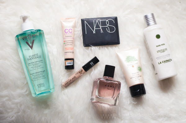 · CC Cream de Bourjois: tras varios intentos de encontrar la BB/CC cream perfecta para mi, le vi esta a Estée Lalonde (essiebutton por los famosos mundos de YT) y viendo su demo me pareció genial. Al principio no me pareció tan genial, pero parece que le he cogido el tranquillo. Deja la piel muy bonita, nada acartonada y se seca pronto, no como la BB cream de Garnier o la de Prisma Natural, por ejemplo, que tardan bastante en secar. Si tengo que ponerle una pega esa es, sin duda, el packaging. Si la dejas boca abajo se acaba saliendo el producto y se desparrama por el tapón. Contiene pigmentos color melocotón anti fatiga, pigmentos verdes anti rojeces y pigmentos blancos anti manchas y tiene FPS 15. La compré por 9€ en Perfumería Ana, pero la tenéis en prácticamente cualquier perfumería y supermercado.