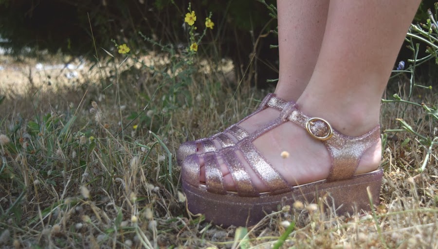 Good morning!! Monday again but now the days are larger and we can do more thing. Now, with this sunny, I love to wear shorts and t-shirts so, I like to add special complements to decorate simply looks like this. In this case, a headband with feathers, a coloured bracelet and my new glitter plastic shoes, a look rounder for daily nonstop. I hope you like it and Happy Monday!!