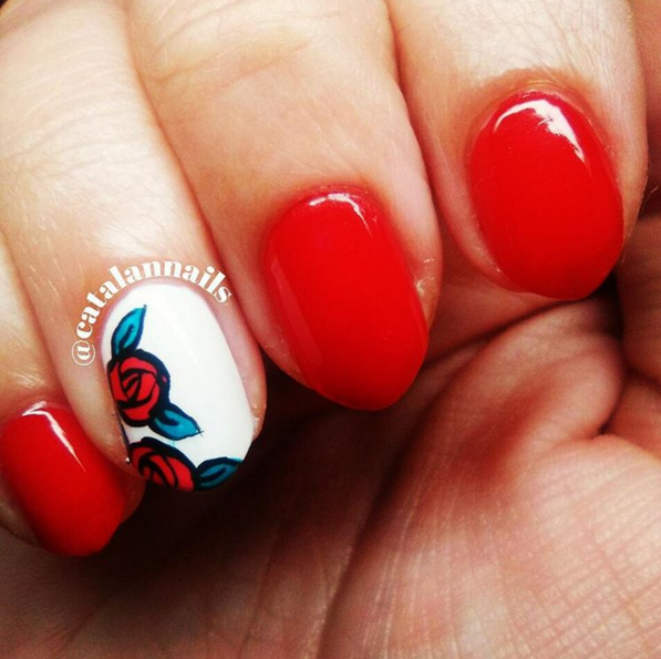 3. Esmaltamos la uña del corazón y del medio de blanco y el resto de rojo.