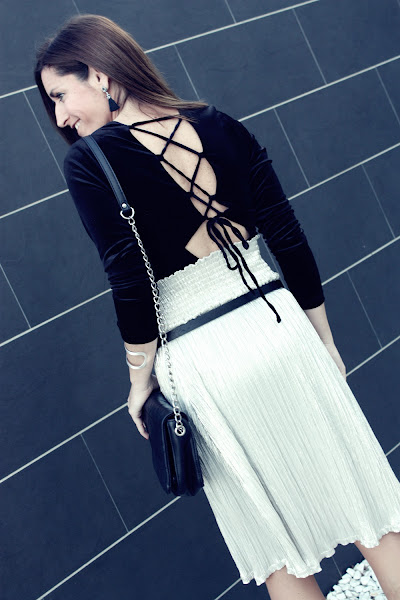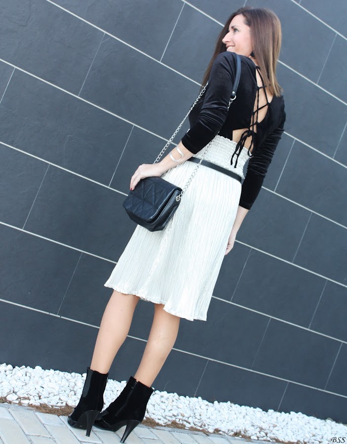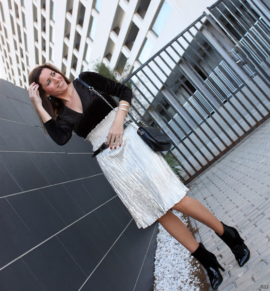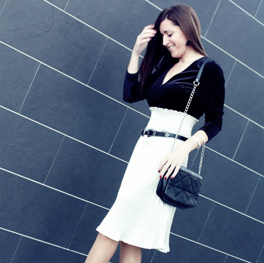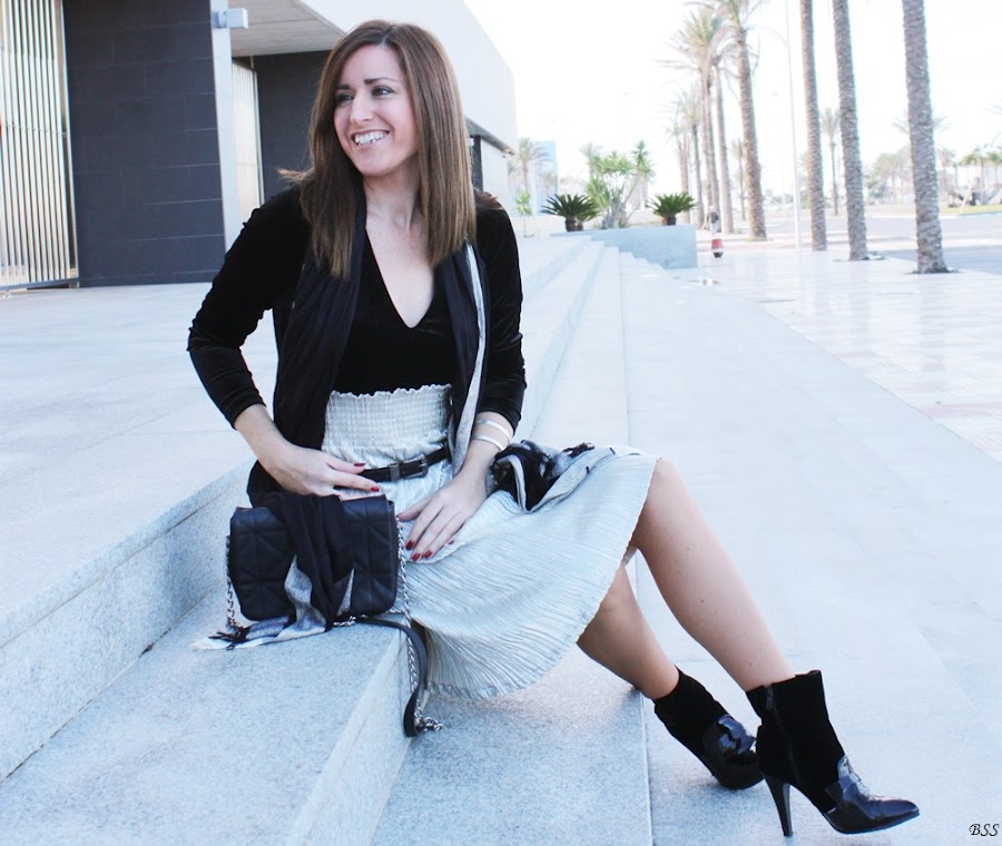 Hoy mi propuesta mezcla dos tendencias muy marcadas esta temporada, las faldas plisadas midi y el toque sofisticado del terciopelo.