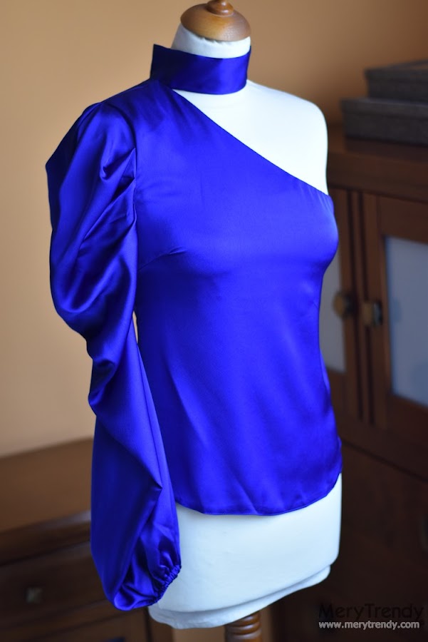 Otro flechazo que estas Navidades he visto en los feeds de las que más saben de moda es esta blusa en tejido de satén sedoso, ultra suave, en un color azul brillante, con un hombro al descubierto y el otro con manga tipo jamón, que la hacen de lo más sexy. ¿Puede haber algo más favorecedor que esta tendencia? Yo creo que no; soy fan, fan de los diseños con hombros al descubierto.