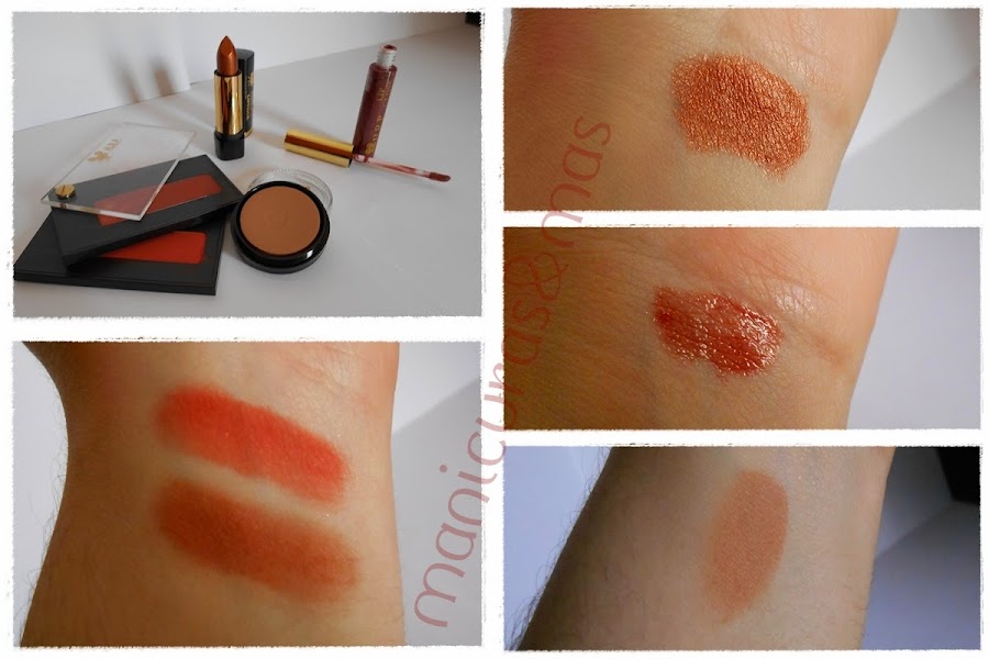 Aún no he utilizado nada, solo lo he probado en los swatches que veis. Así que lo único que os puedo decir es que los coloretes pigmentan un mónton (no sé como me los voy a aplicar sin acabar pareciéndome a Heidi jaja); el maquillaje me va oscuro, así que intentaré usarlo como contorno; el labial tiene un tono cobrizo que no creo que use, la verdad, considero que es un tono muy particular como para regalarlo a todo el mundo; y el gloss, puede que lo use, aunque tengo que vérmelo puesto para ver que tal me queda.