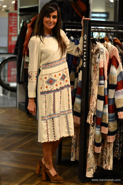 He tratado de crear un look divertido y alegre (muy en mi línea) a un precio irrepetible para darle la bienvenida al fin de semana como se merece, compuesto por un vestido midi en color beige con manga larga y cuello redondo, con trabajo bordado de estilo étnico