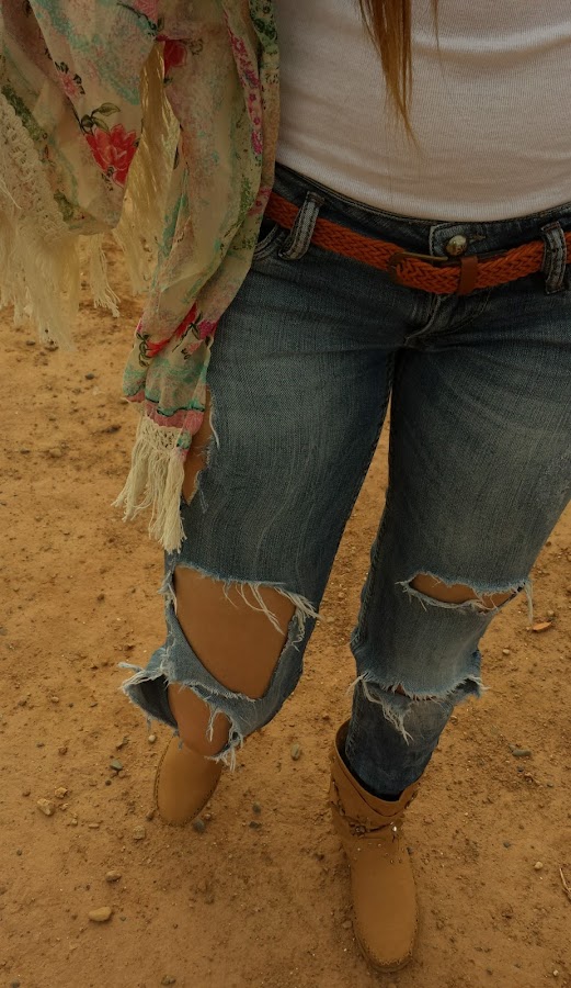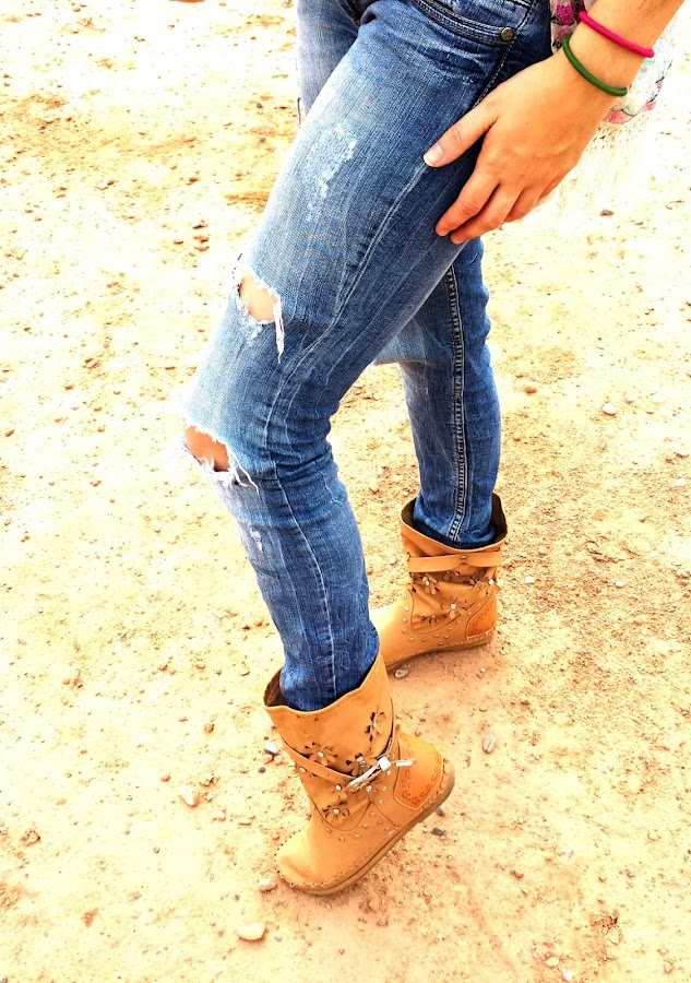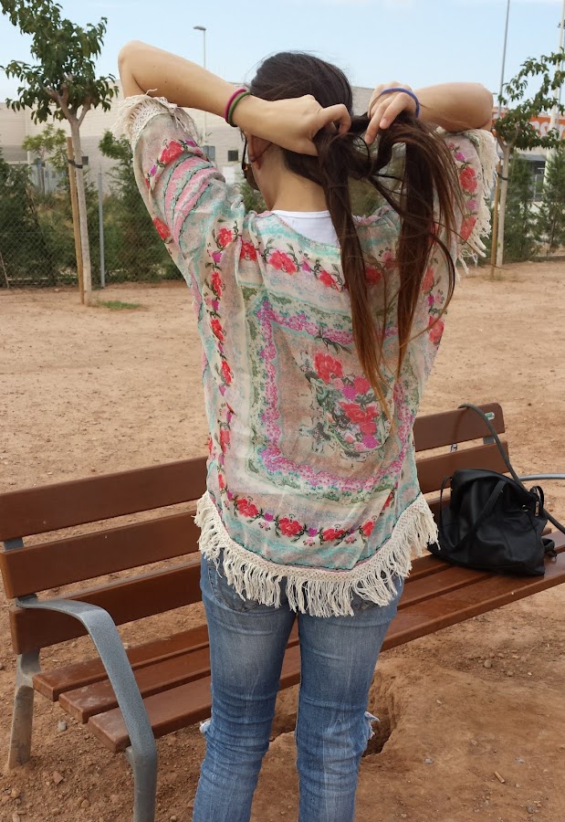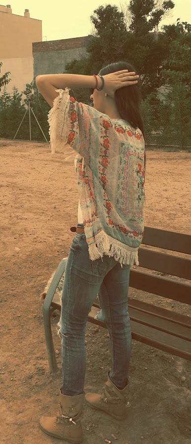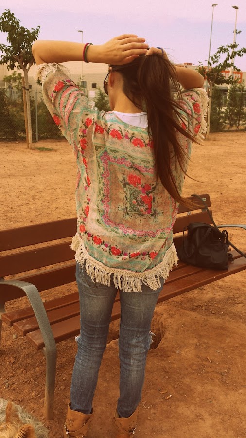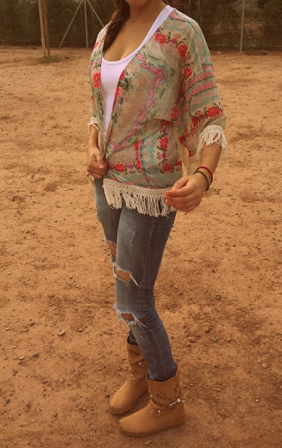 Jeans de Bershka, que cada vez que me los pongo acaban un poquito más rotos, pero no, no..no se tiran, camiseta básica de Shana, botines tipo indianini, kimono de Aliexpress que me costó aproximadamente 6 € y gafas de sol también de Aliexpress que me costaron sobre 2 €.