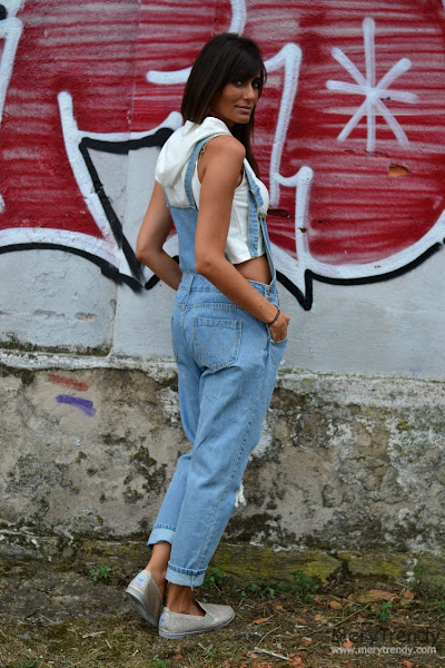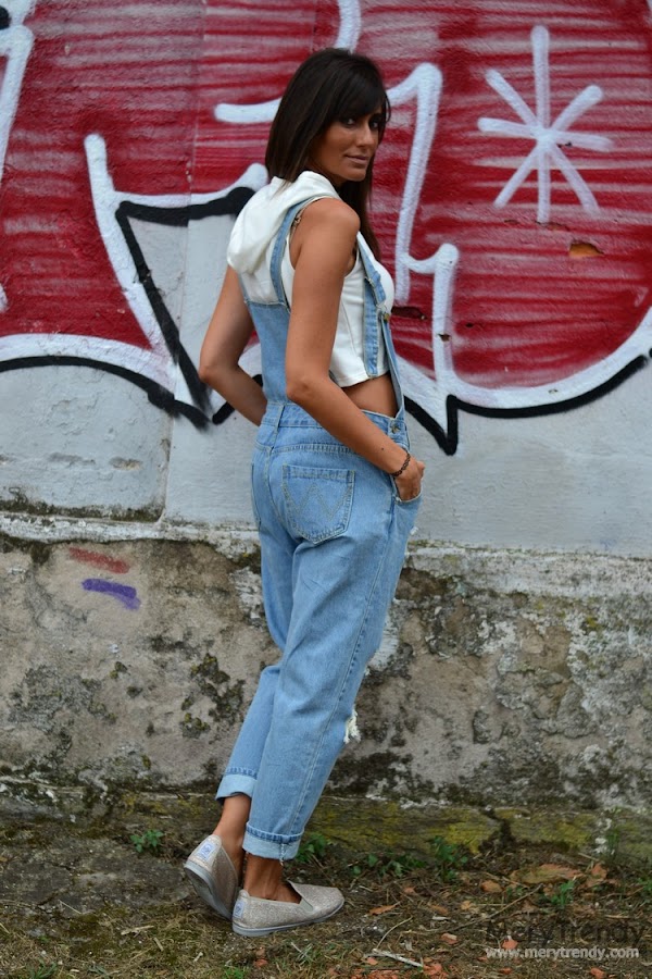 Volviendo al look de hoy, deciros que, no se me ocurrió mejor manera de estrenar mi peto denim que, por cierto, casi deja a la vista más piel que tejano... Jijij con un crop top con capucha en blanco, con el archiconocido lema estampado en la parte delantera del mismo "First, I need coffee", ahora que todavía hace calor. Una combinación un tanto arriesgada porque no todos los cuerpos están hechos para vestir prendas boyfriend ni crop tops.
