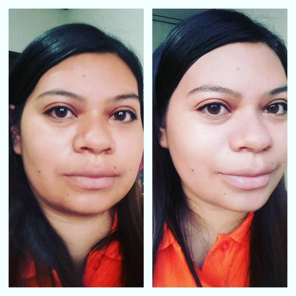 Recomendadisima esta base, yo soy morena y me aplique true beige 222 aquí te muestro unas fotos de antes y después de aplicar la base sin maquillarme