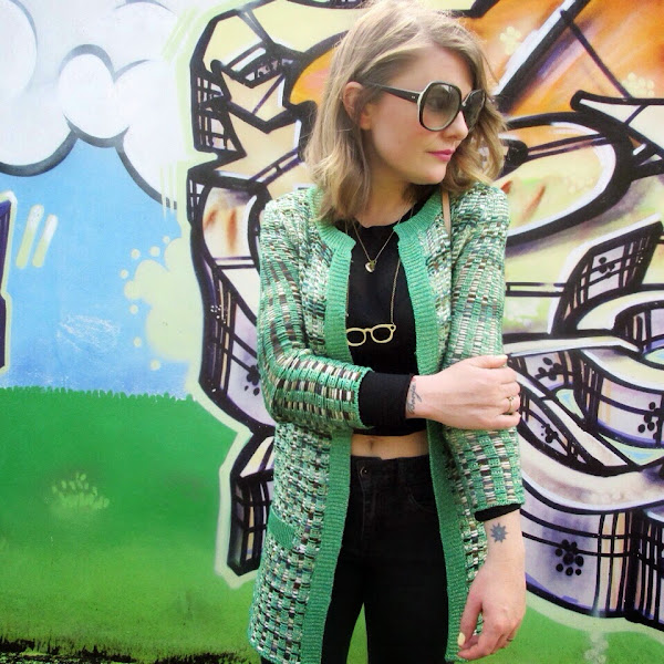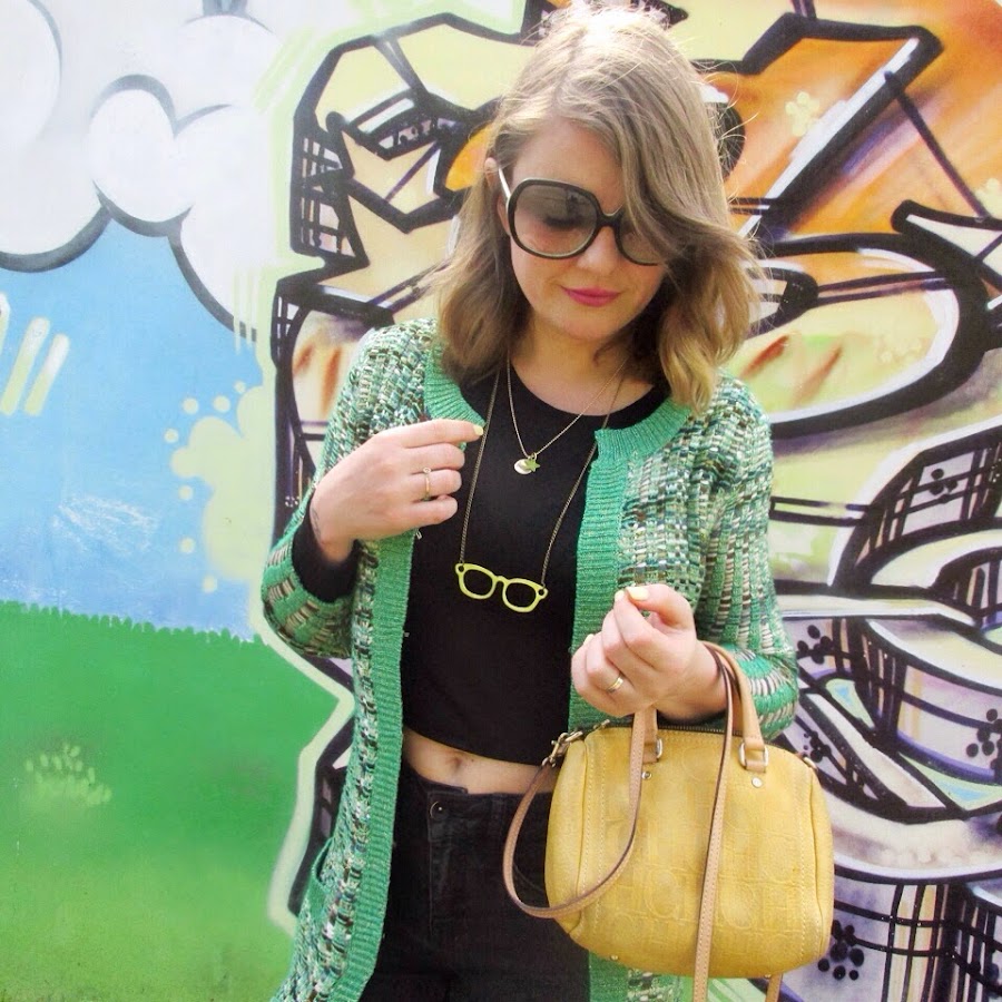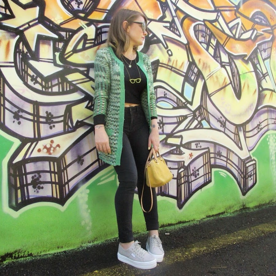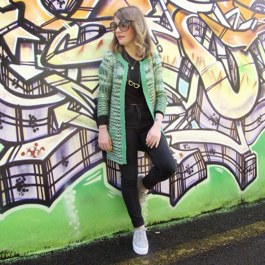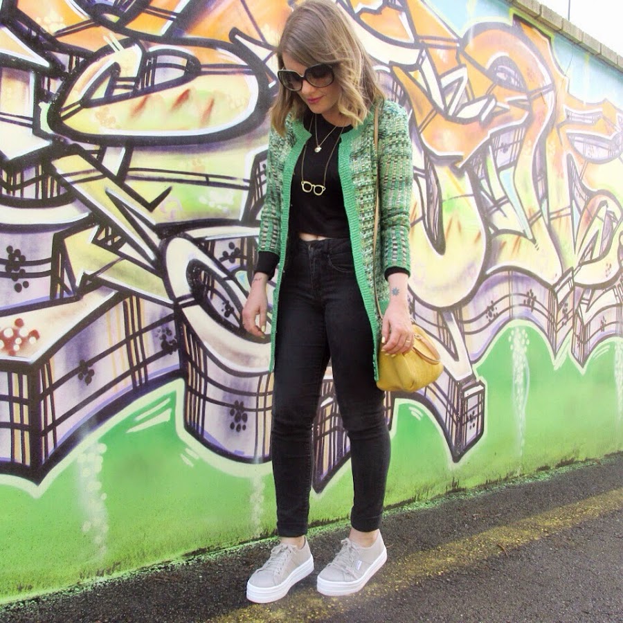 Un look sencillo con prendas negras y el color con la chaqueta y el bolso.