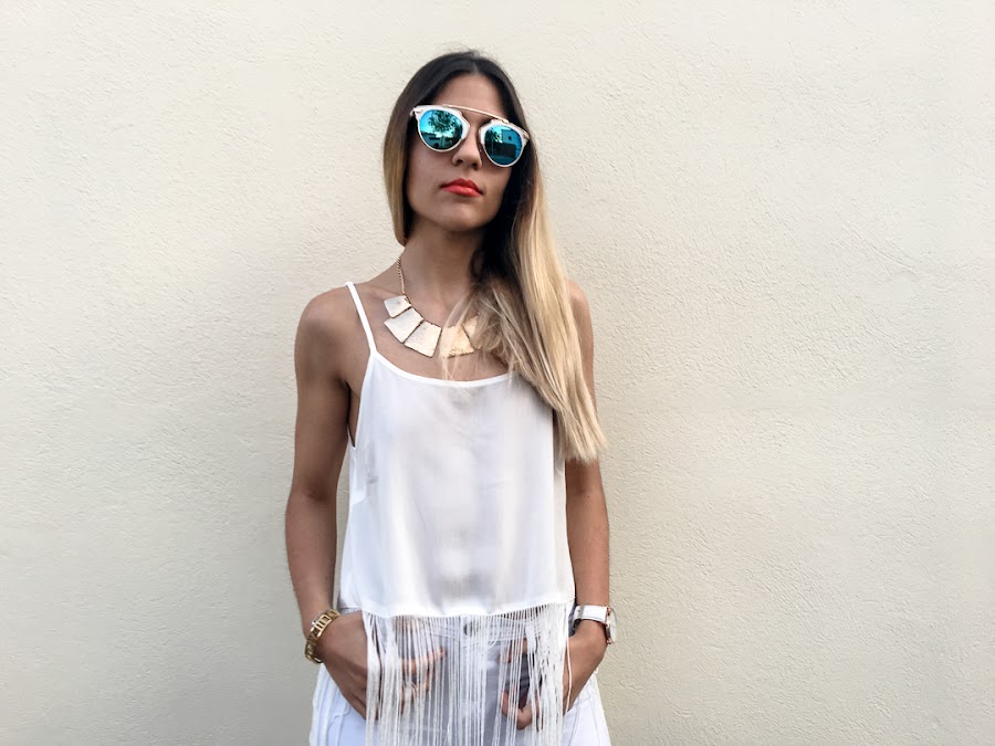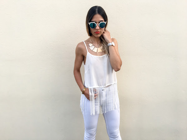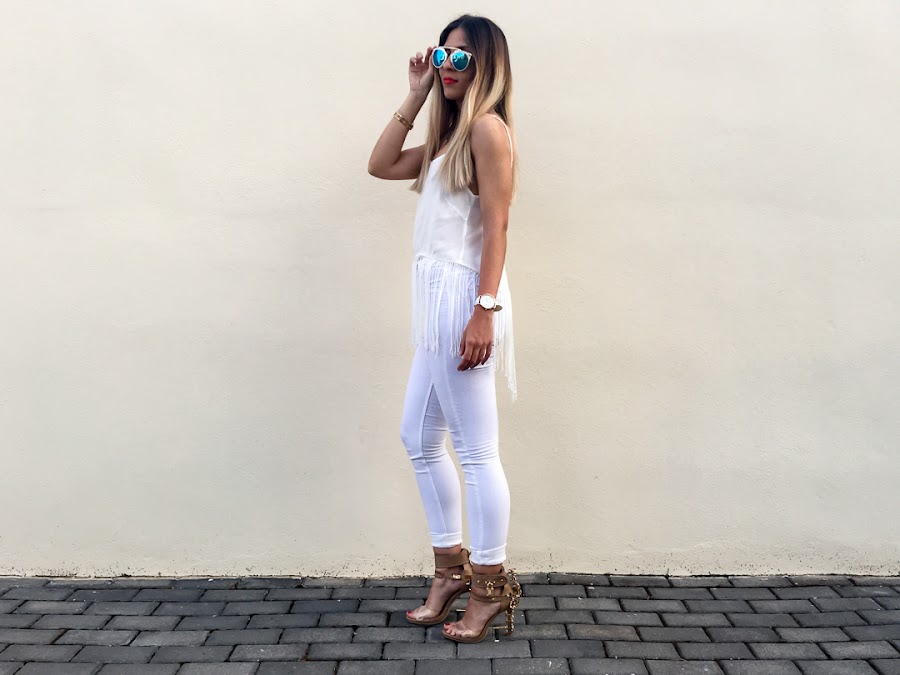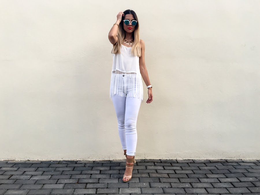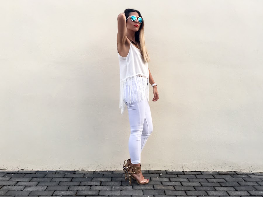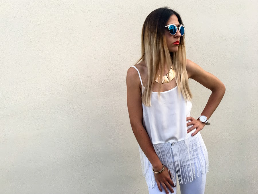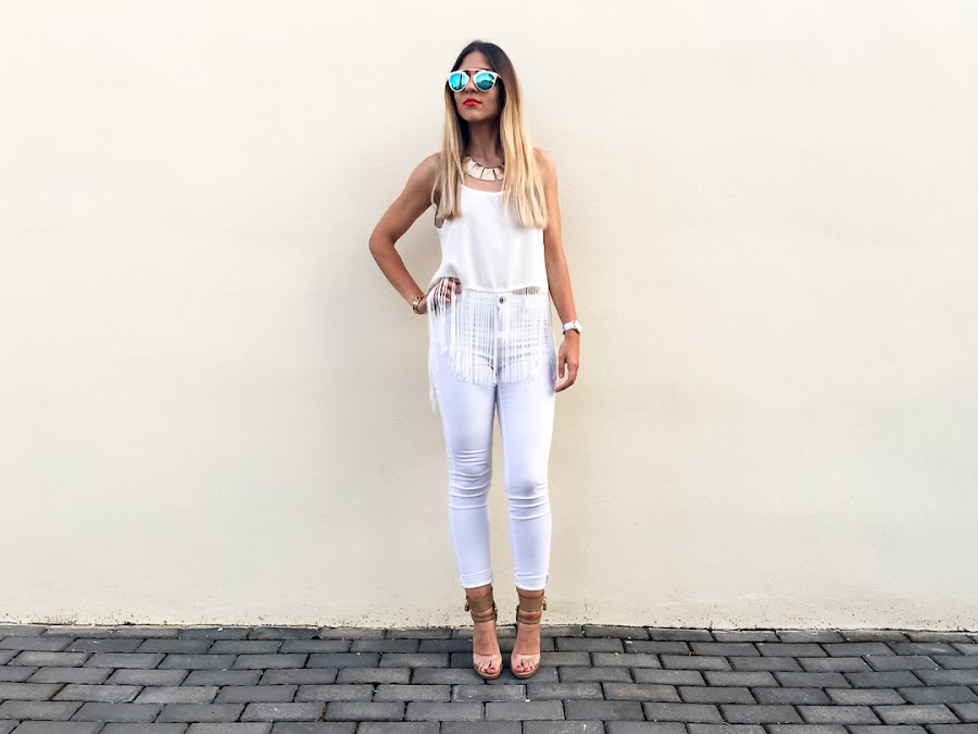 Bueno y ahora ya si voy al look que os tengo preparado para hoy, que me enrollo!! Qué mejor look para el veranillo que un outfit total white con una camiseta de flecos y espalda descubierta que habla por sí sola y unos jeans blancos.