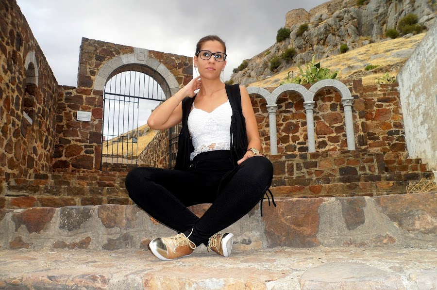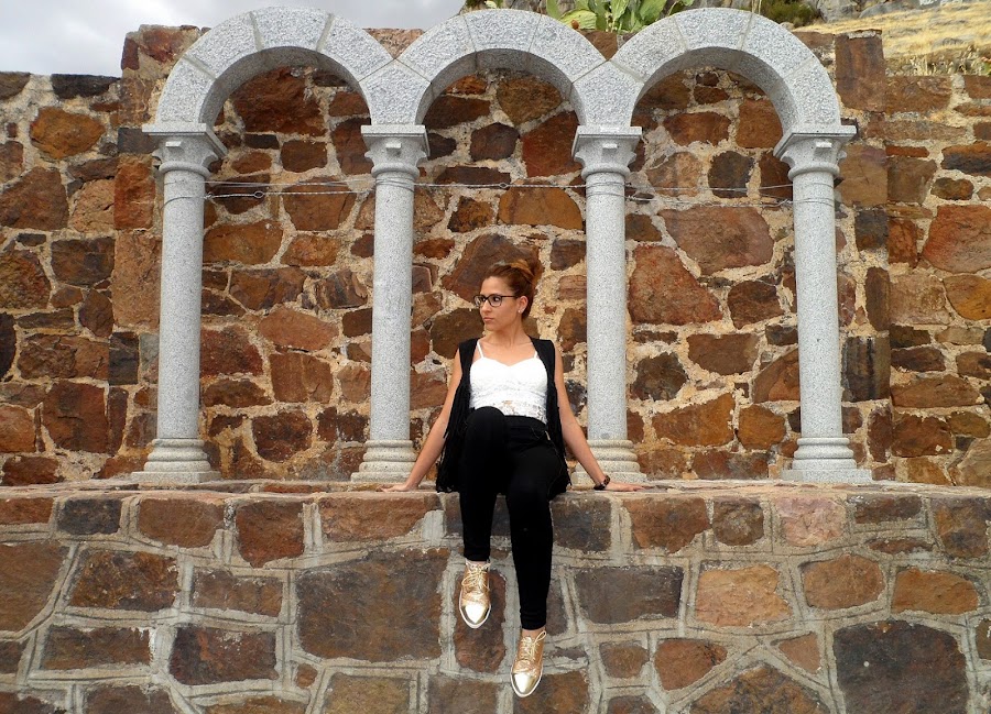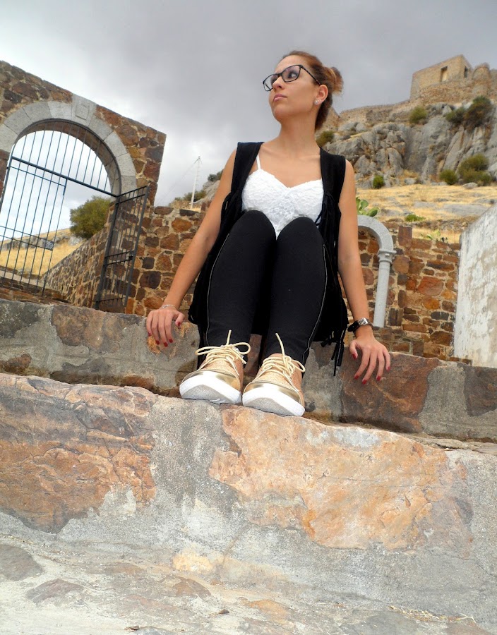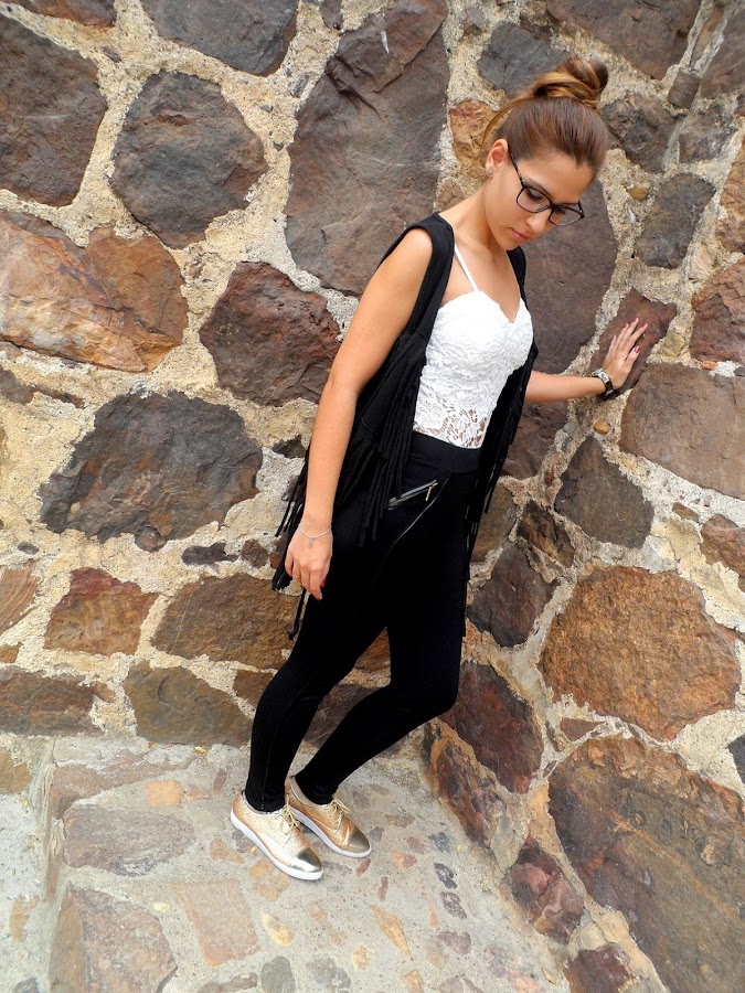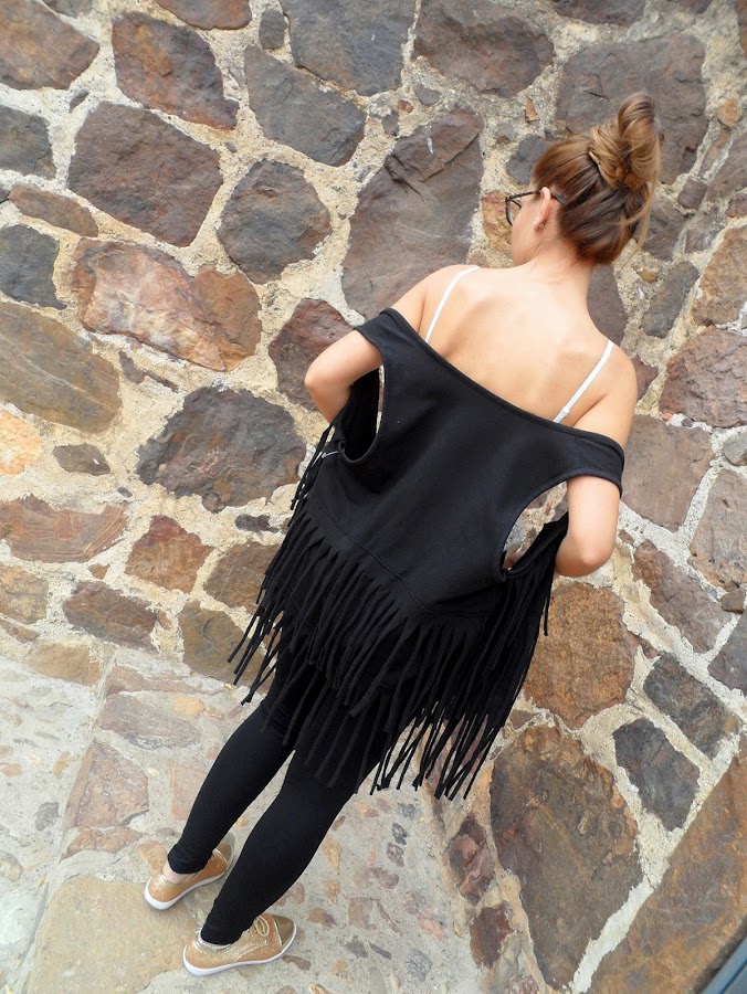 Para el look de hoy he elegido unos leggings negros con detalles de cuero en los bolsillos y un filito en cada pierna, que le dan un toque rockero y más combinadas con mis nuevas sneakers doradas, que os enseñé no hace mucho y que tanto os gustaron.