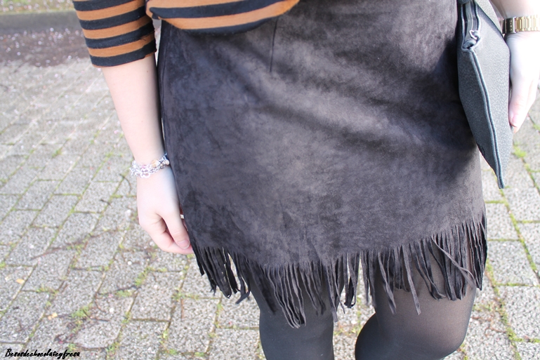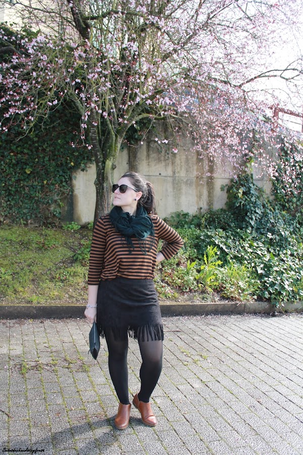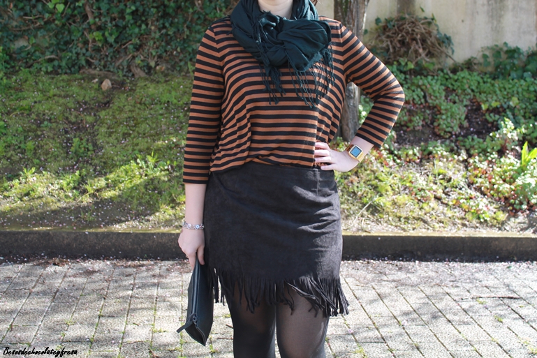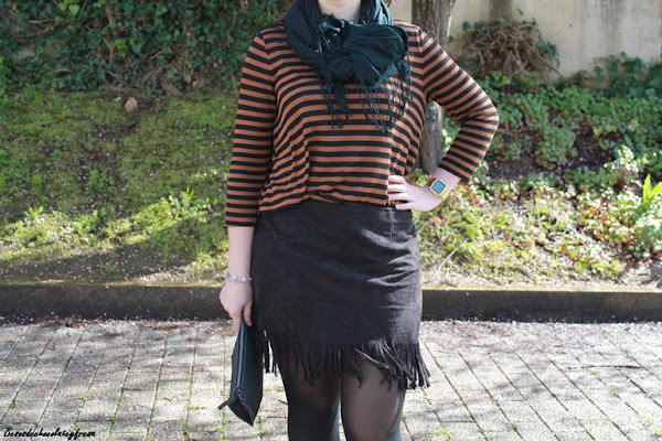 Hoy os muestro un look en tonos marrones y negros en el que el protagonista es mi nueva falda de flecos y antelina que me compre las pasadas rebajas en Okeysi. En esta ocasión decidí combinarlas con camiseta de rayas en marrón y negro, botines y abrigo peluche en marrón, clutch y fular en negro.