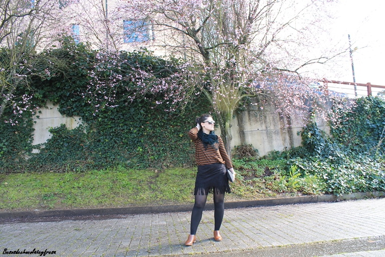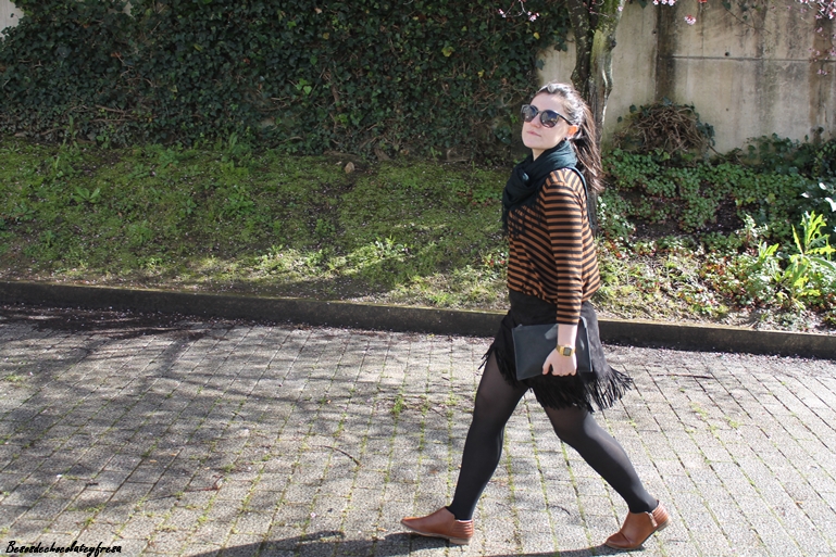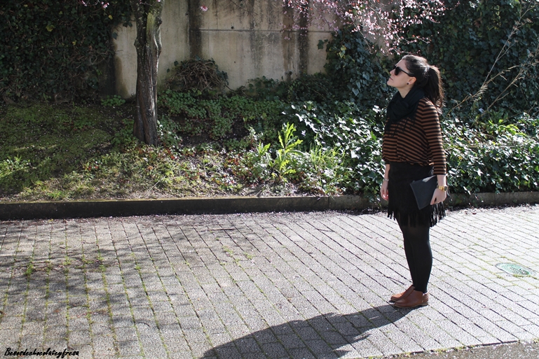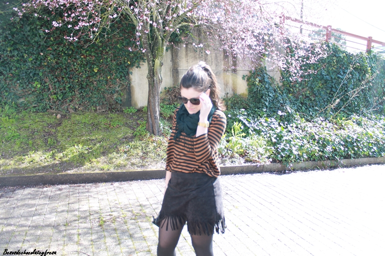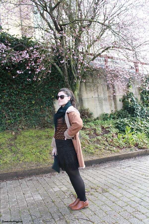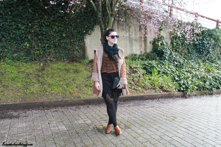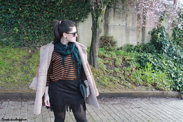 Today I show you a look in brown and black tones in which the protagonist is my new suede fringed skirt that I bought the last sale in Okeysi. This time I decided to combine with striped shirt in brown and black, boots and coat in brown bear, clutch and scarf in black.