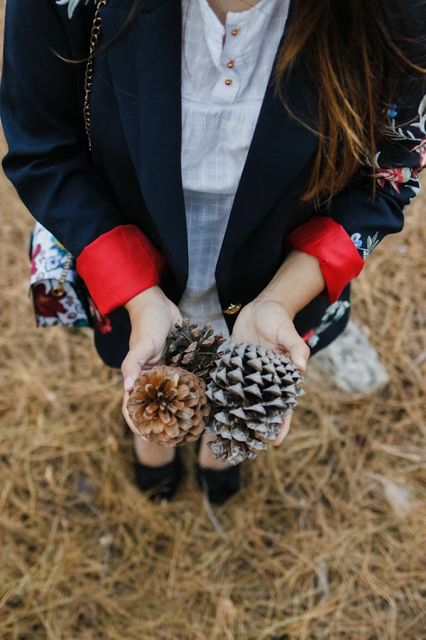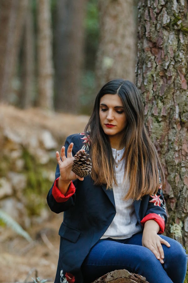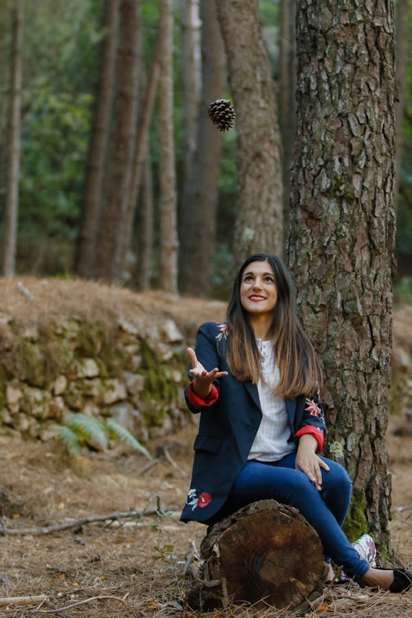 Como curiosidad, el día que hicimos las fotos fuimos al Parque Natural de Las Batuecas (¡no hay que perdérselo!) pensando que encontraríamos un paisaje otoñal. No fue así. Pero sí que encontramos PIÑAS y estuvimos un buen rato jugando a lanzarlas y haciendo bobadas como si fuéramos niños pequeños. Eso sí, no os aconsejo ir con bailarinas con tacón, eso seguro.