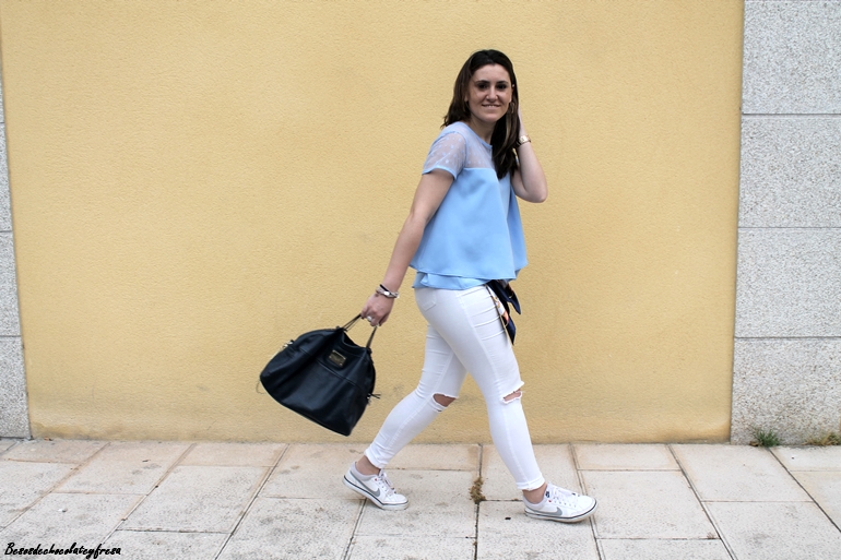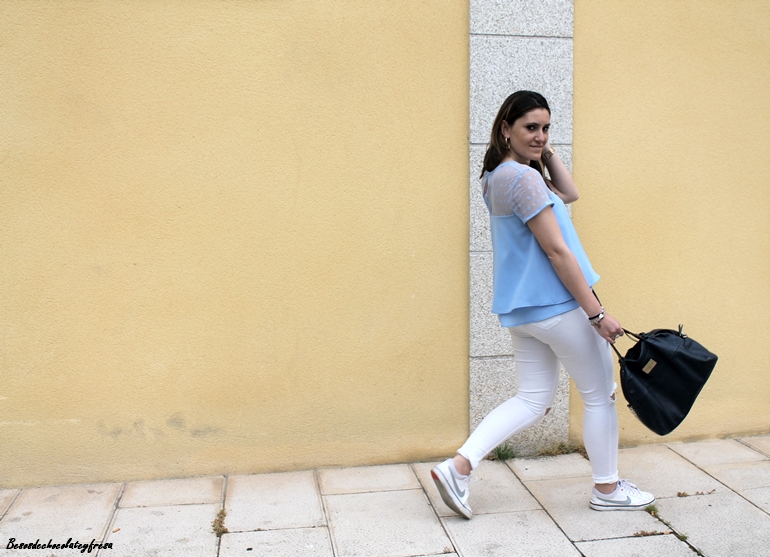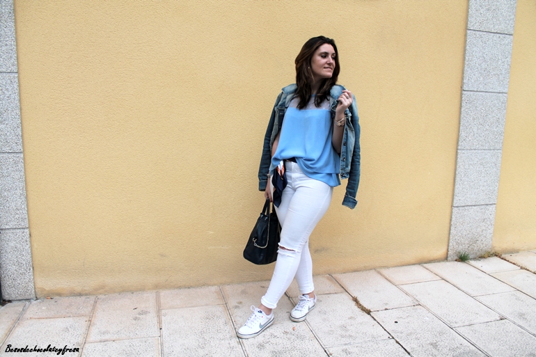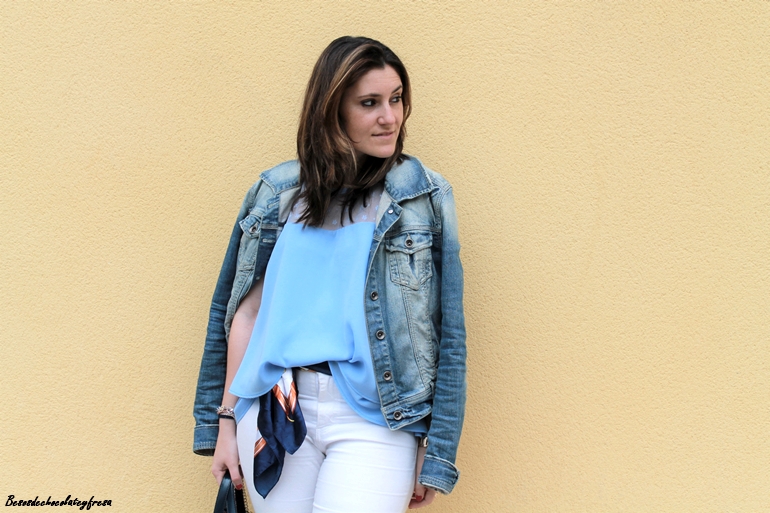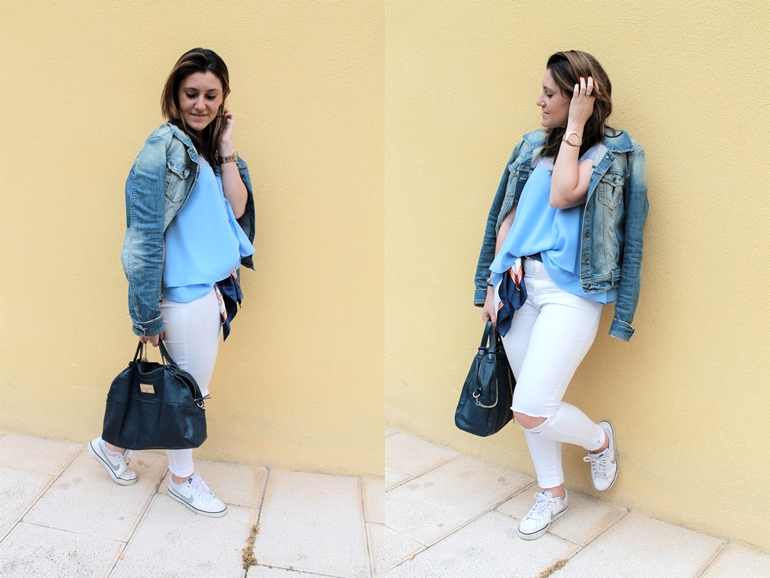 Es el color perfecto para combinar con colores pastel, como gris perla o el rosa o tonos intensos como el amarillo, naranja o con colores de la misma gama como el azul marino, pero sin duda con dos colores con los que siempre se triunfa es con el negro o con el blanco.En esta ocasión me decanté por un color seguro como es el color blanco para los pantalones y las sneakers, y azul marino en los complementos como el bolso y el pañuelo a modo de cinturón. Pendientes dorados y chaqueta denim completan el look de hoy