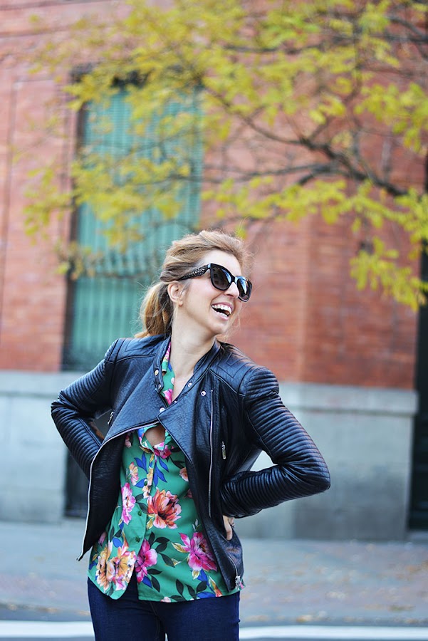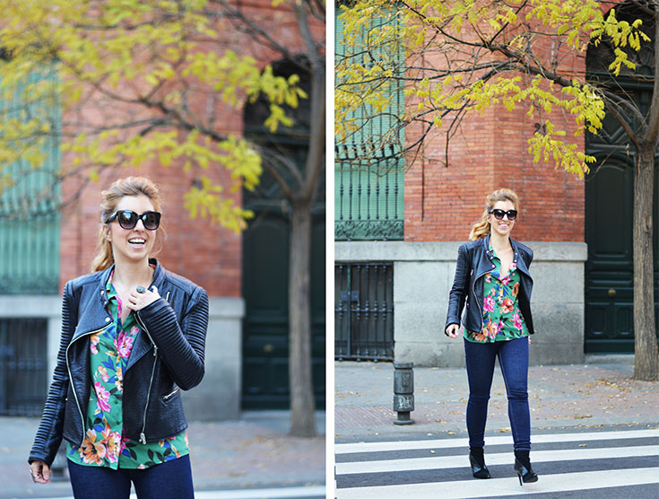 Floral shirt: Shein / Biker & Booties: Zara / Jeans: Levis