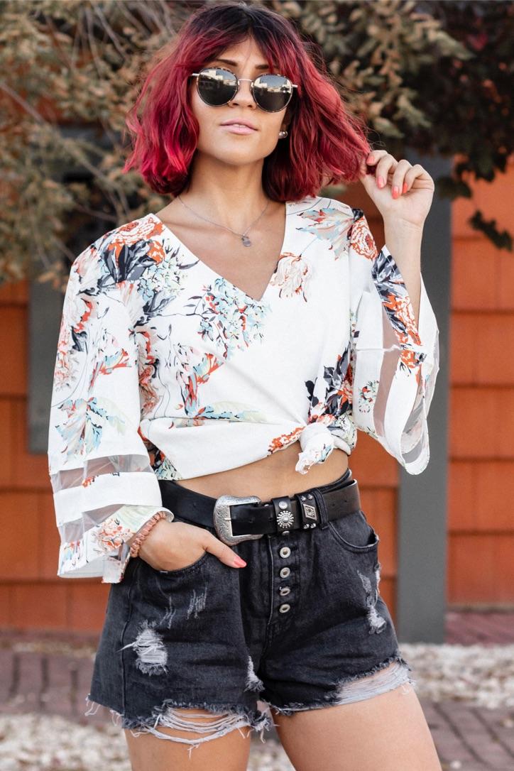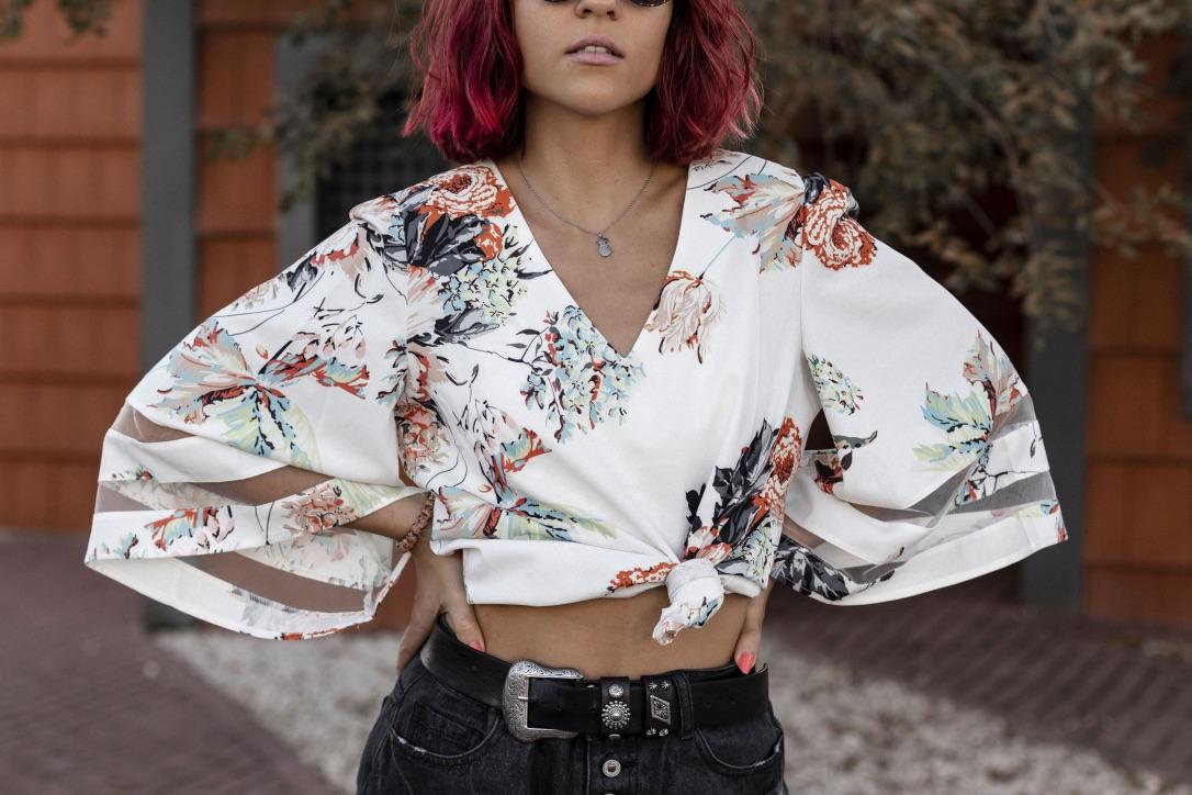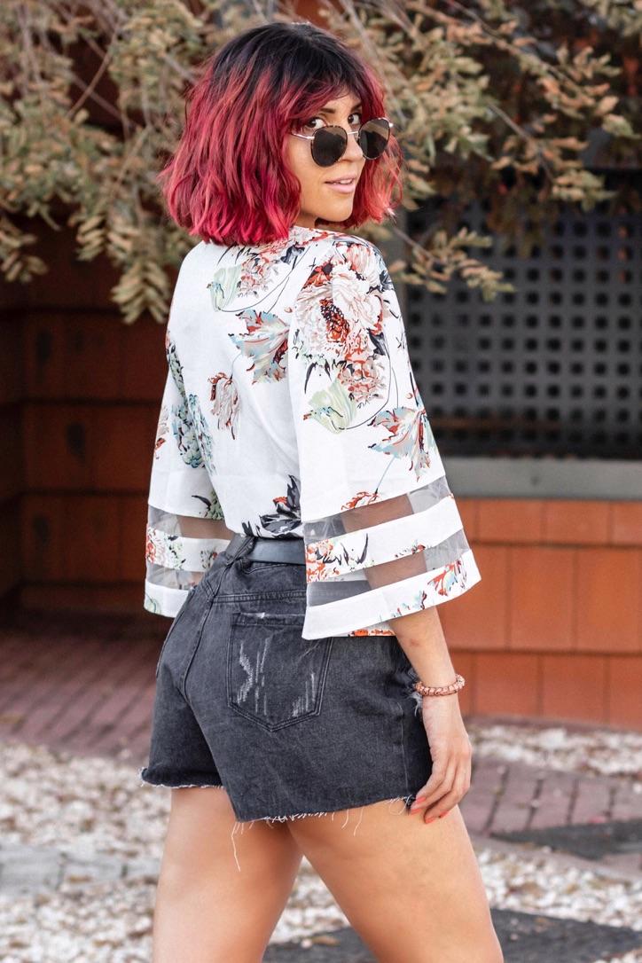 And now yes, I’m going to look today. It is a total look of LOOKBOOK STORE, with a floral print blouse with very cool colors and the same transparent detail on the sleeves as the blouse that I showed you the other day and they are flared. The blouse is quite wide so I have knotted it.