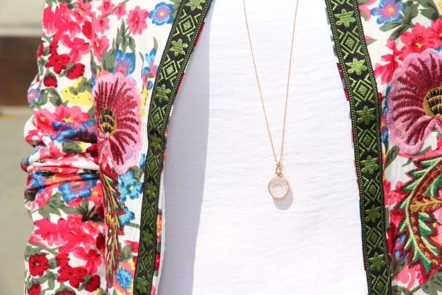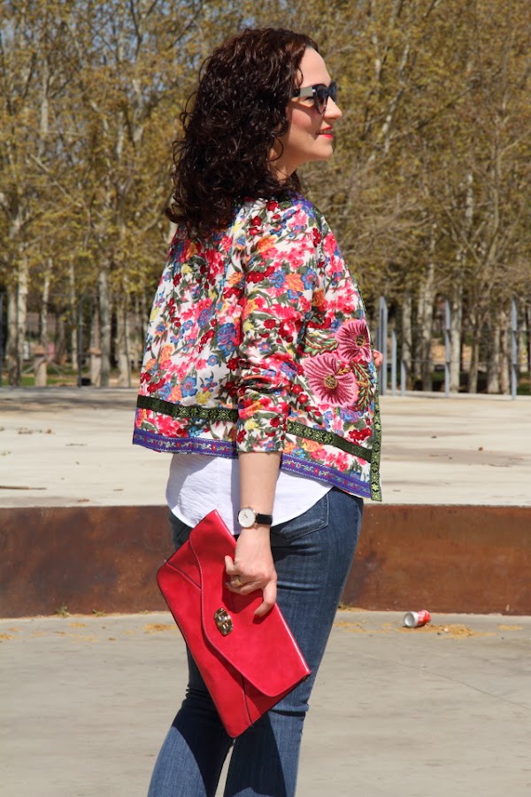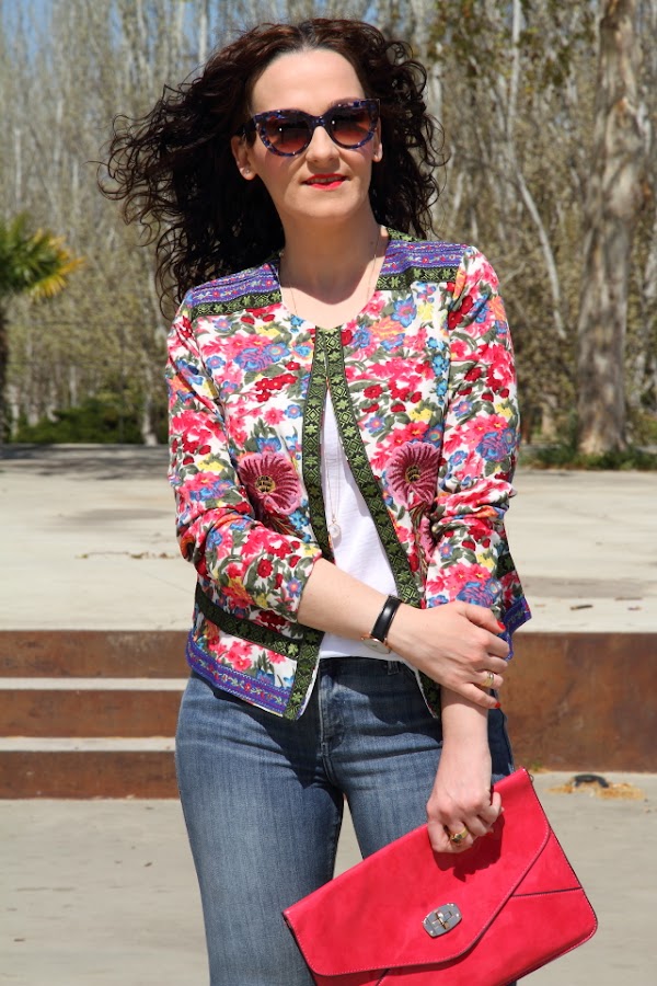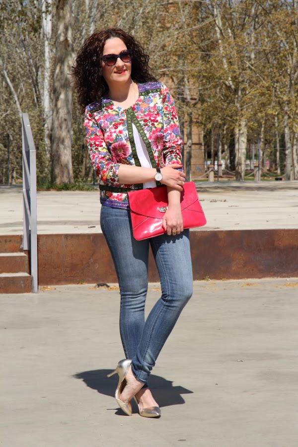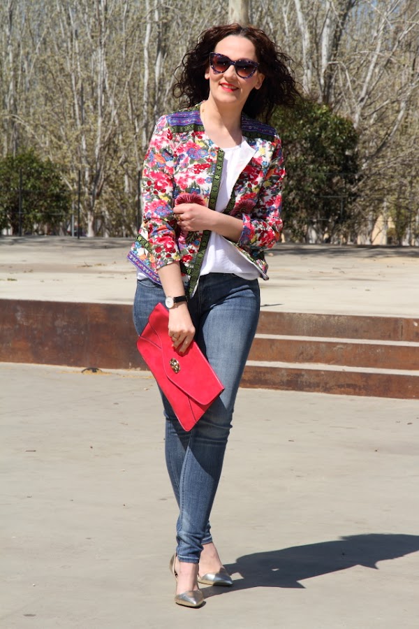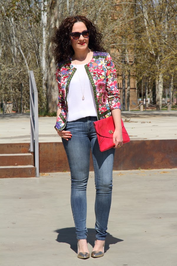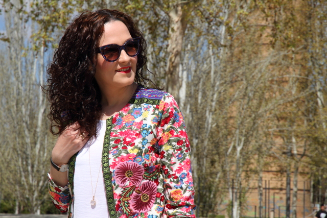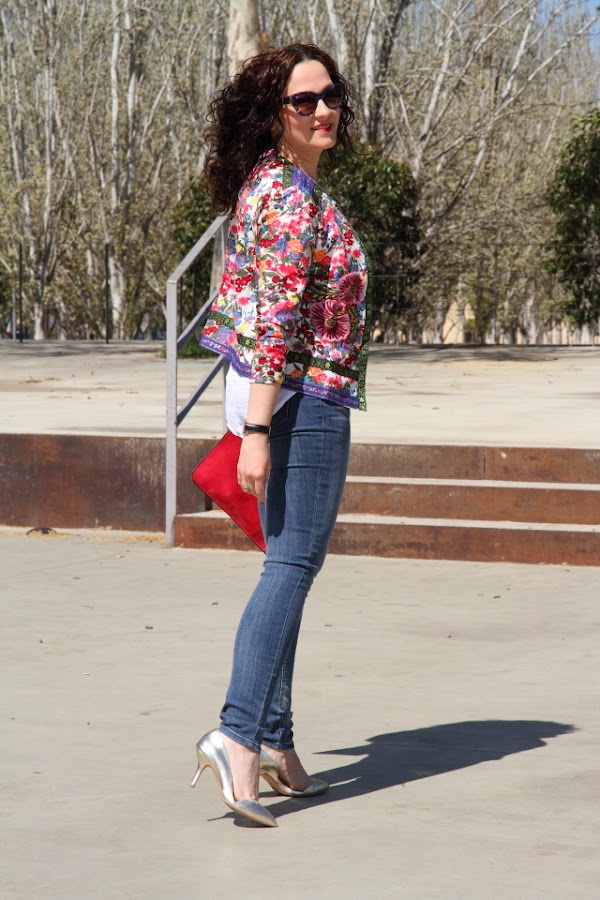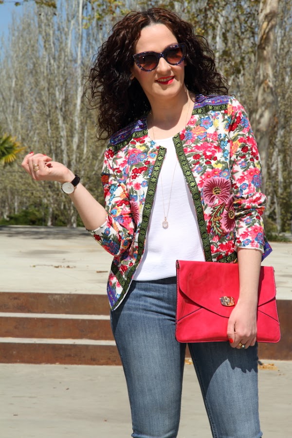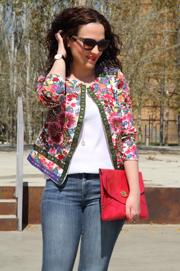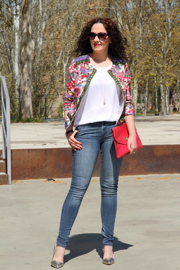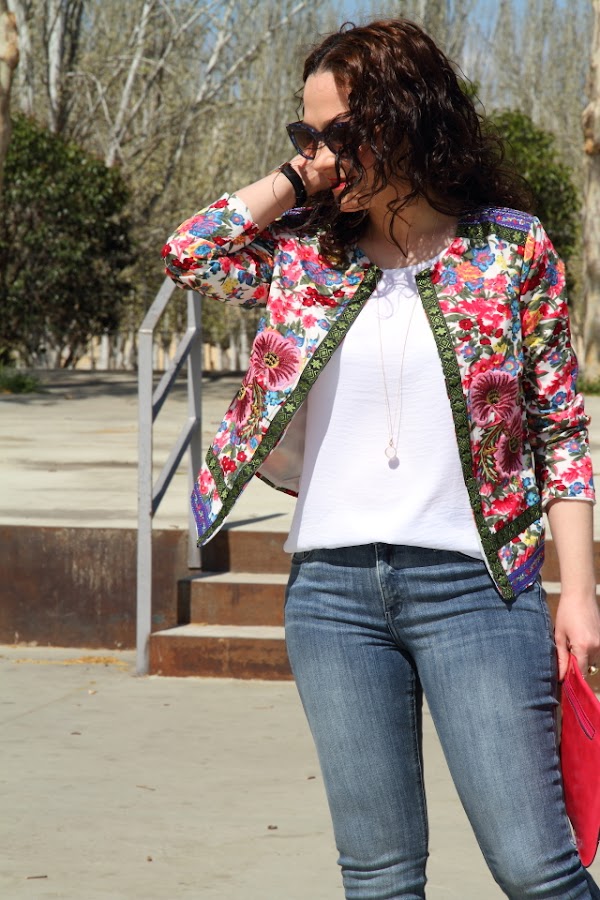 Pese a que decían que para Semana Santa íbamos a tener mucho aire, finalmente el tiempo se ha comportado y nos ha dado unos días geniales. Este look es el que me puse ayer para disfrutar del último día de vacaciones ya que aquí también era festivo. Con el sol tan bueno que salió y la temperatura tan agradables que había decidí estrenar esta chaqueta de flores, me llegó hace unos días y estaba esperando al buen tiempo para ponérmela. Me encanta el outfit tan primaveral que he conseguido con ella, es tan bonita que no necesita mucho más así que la he combinado con unos jeans pitillo y un top blanco.