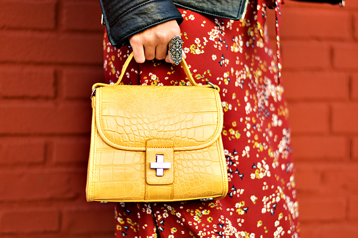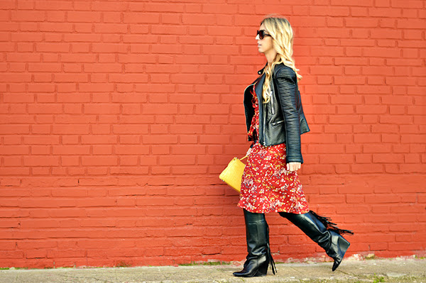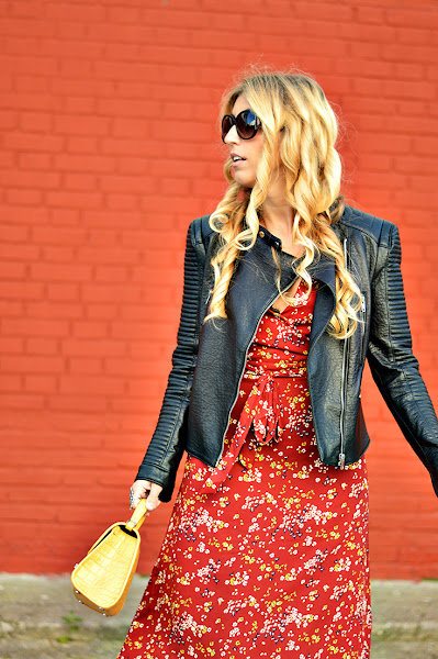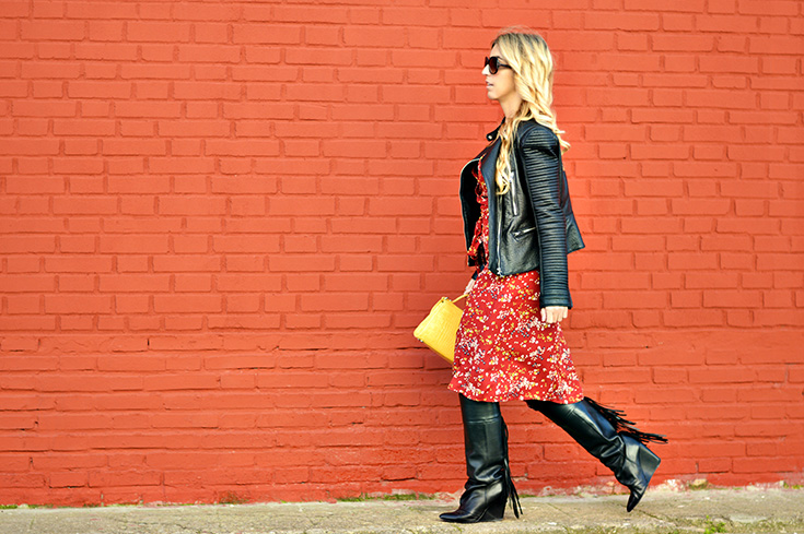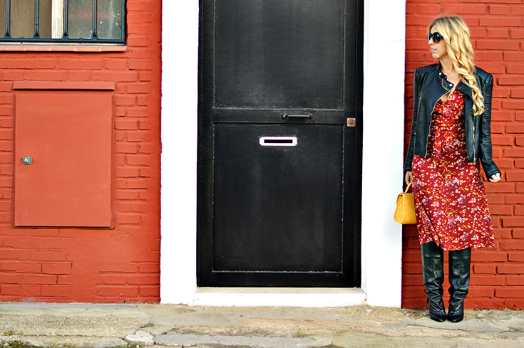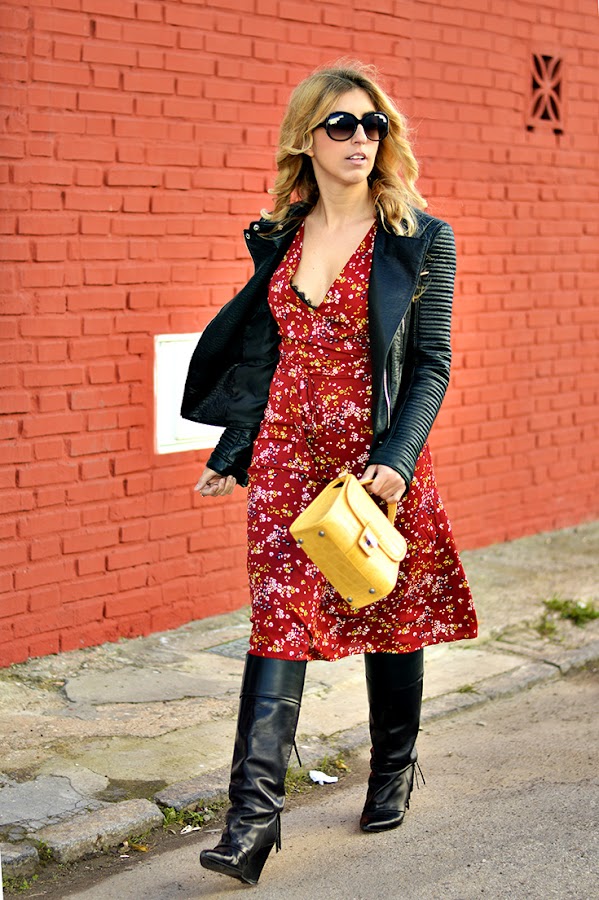 Floral dress: Easy Wear / Boots: Mango / Leather jacket & bag: Zara