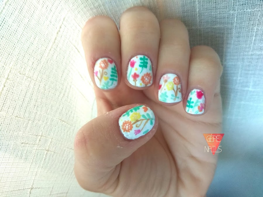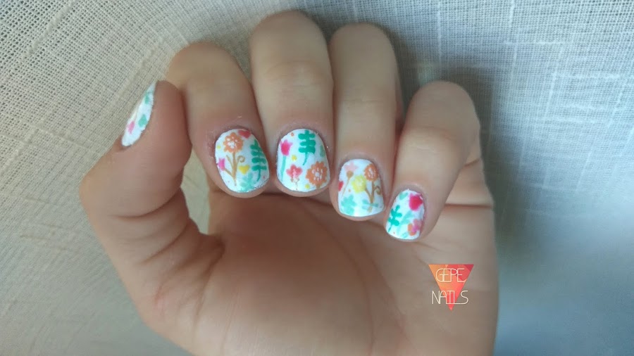 Para las flores, como ya he dicho, usé los mini esmaltes de Primark. Los recomiendo mucho, pero solo para hacer dibujos encima de una base, ya que son como pinturas acrílicas.