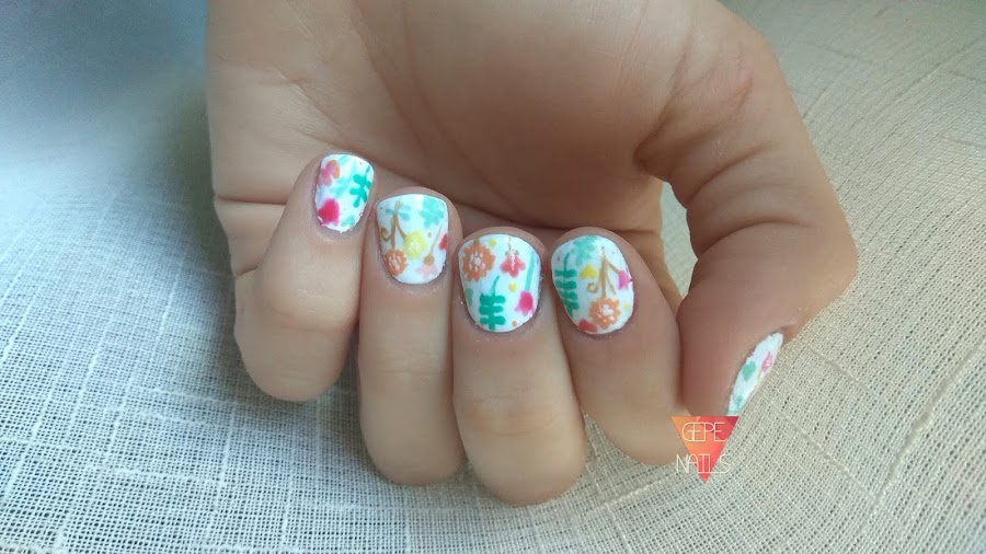 Retomo el blog con una manicura muy cuqui. Me inspiré en un estampado que ví por internet (borré la foto y no puedo ponerla, ¡lo siento!) pero era tan bonito que tuve que hacermelo en las uñas.