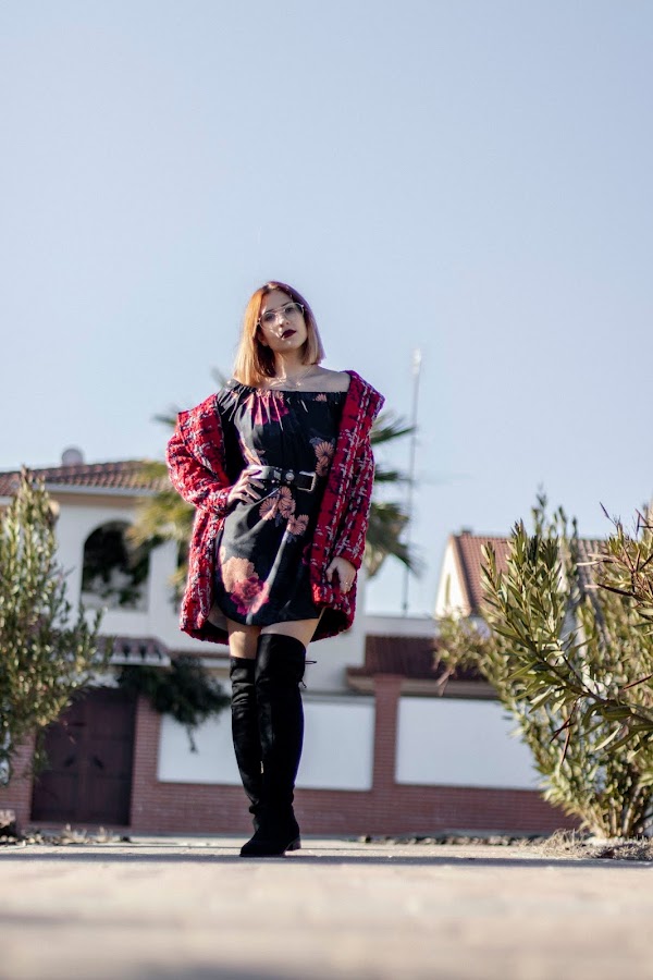 Lo he combinado con un abrigo de color rojo y unas botas altas hasta los muslos de XTI.