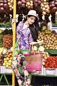 Además, al usarlo sentí que era un estilo medio pijama. No es de seda, pero da la impresión de esta tendencia que también me encanta. Los accesorios, dentro de la misma paleta de colores fueron de mimbre: sombrero y bolso tipo canasta, y con aretes largos.