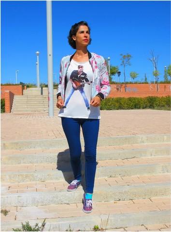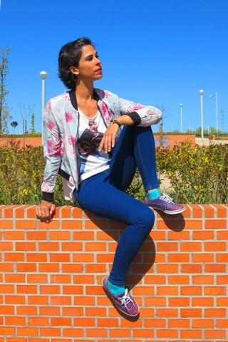 Chaqueta de Aliexpress , de corte por la cintura, abrochada en cremallera, me encantó por los dibujos y los colores llamativos que tiene. Combina genial con este look más casual y con otros más arreglados. Proporciona el abrigo suficiente en estos días raros de sol y lluvia.