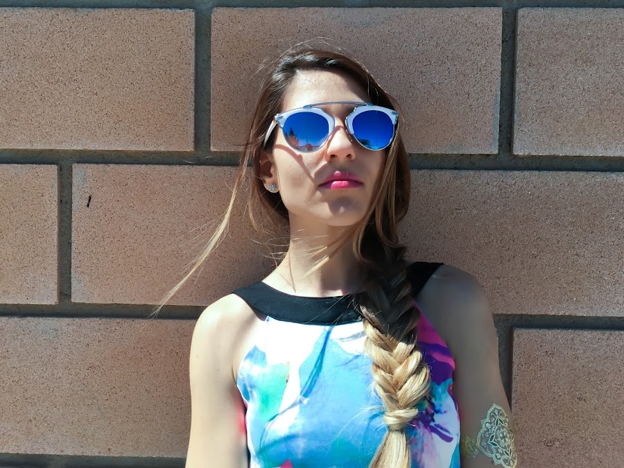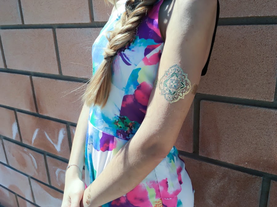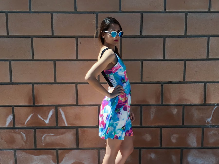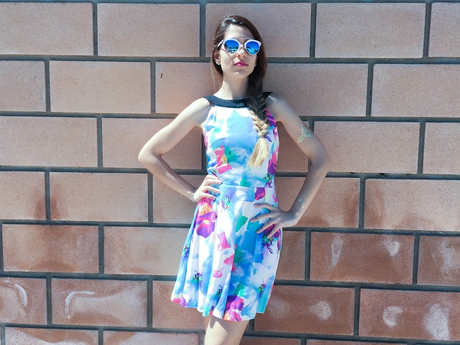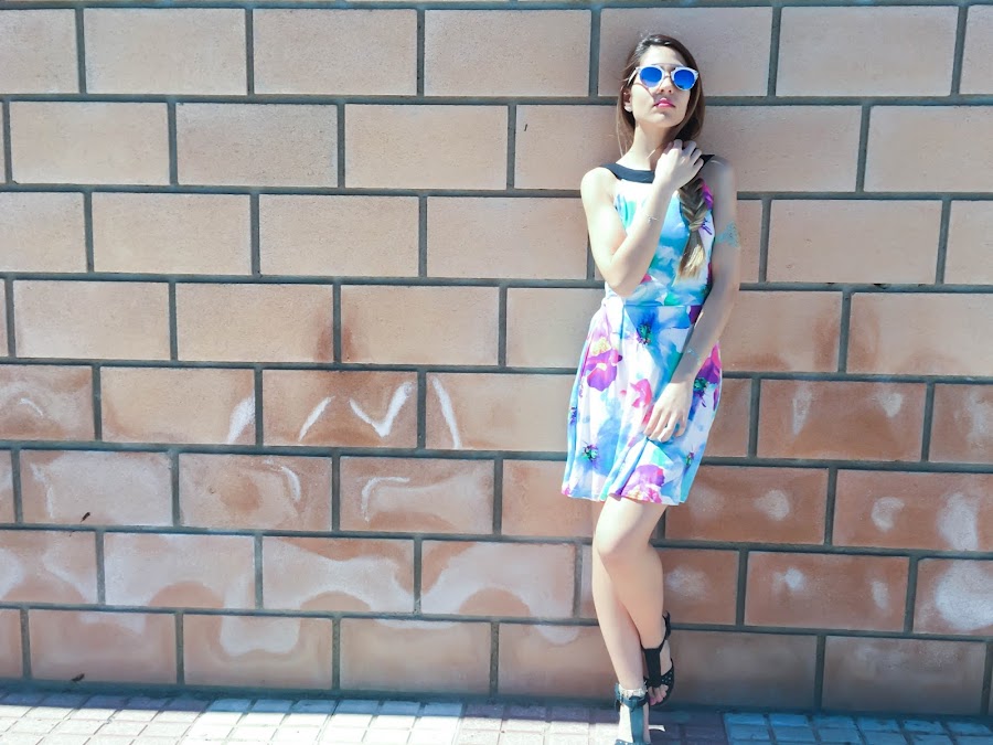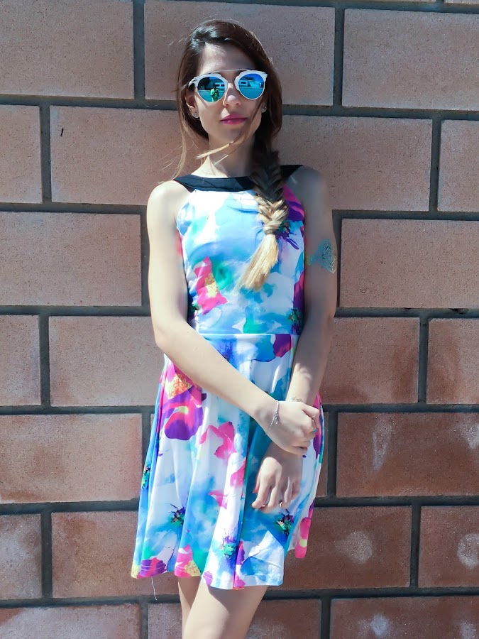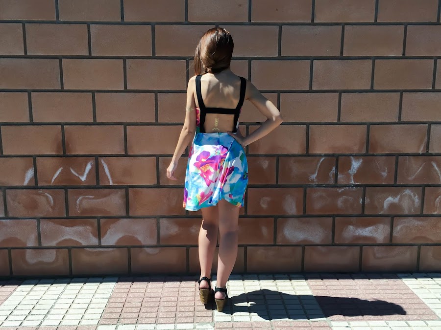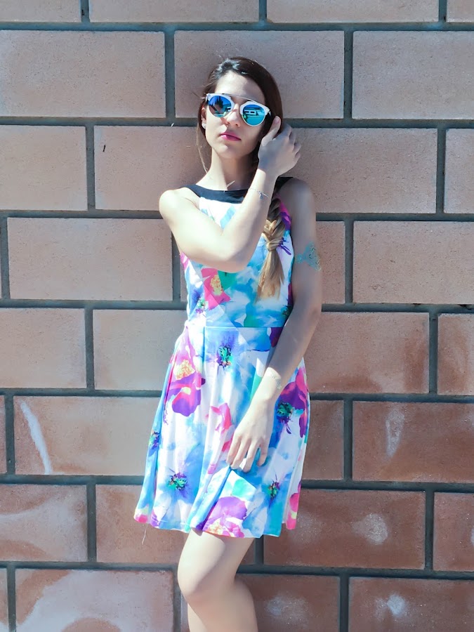 Si queréis un vestido alegre, éste es el vuestro, sin duda!! Con un estampado de flores súper colorido y muy fresco para el verano. Pero lo que más me gusta de todo, es su original espalda! Ya sabéis que me encantan los escotes backless pero este es súper original con un borde en negro que hace que resalten más sus colores!! Además, he completado el look con unos tatoos temporales dorados y unas gafas de sol súper chulas!