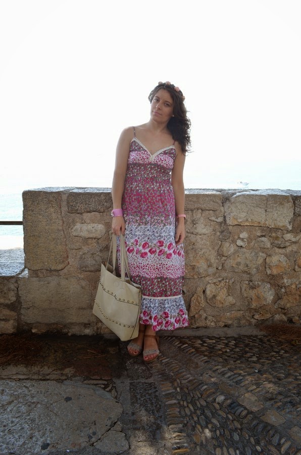 Vestido: Tienda local Peñiscola / Sandalias: Carlos Reula / Bolso: Old / Corona de flores: Tienda local Vall d"uixó / Pulsera: Trendy Accessories