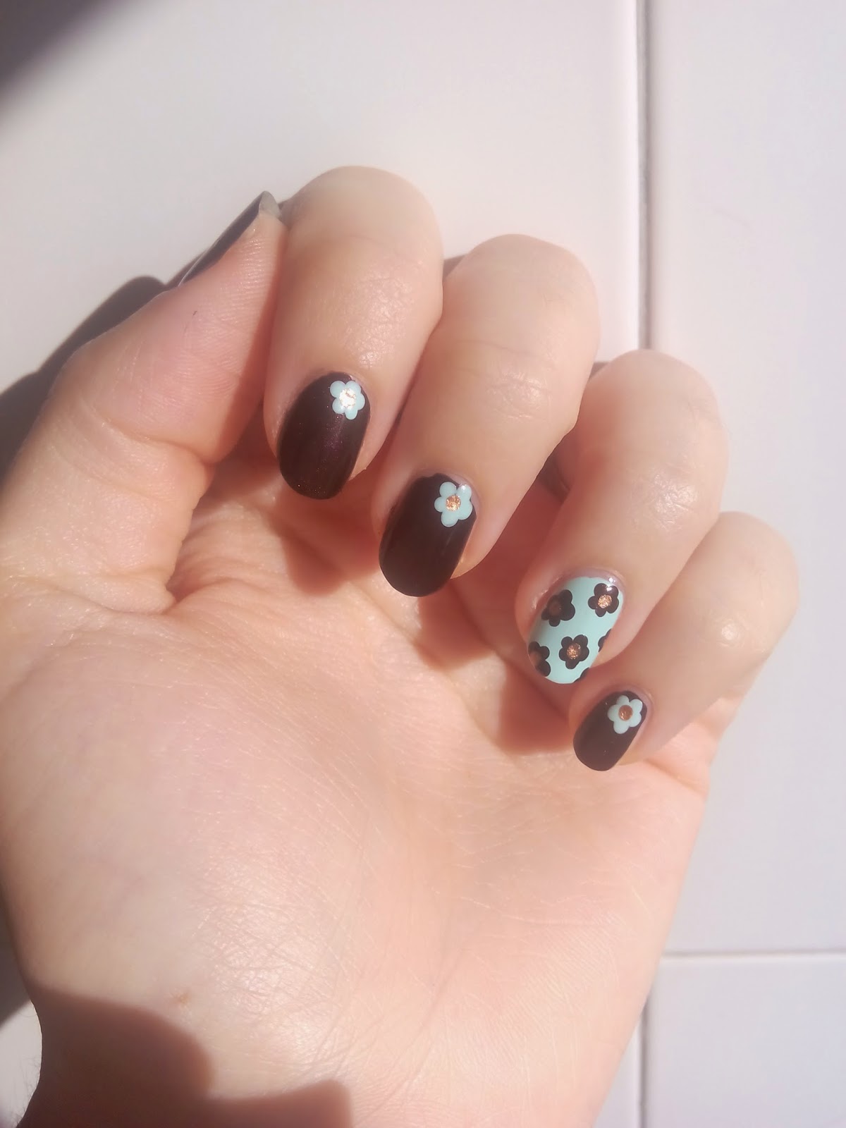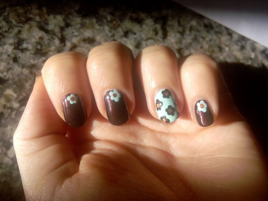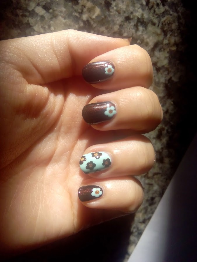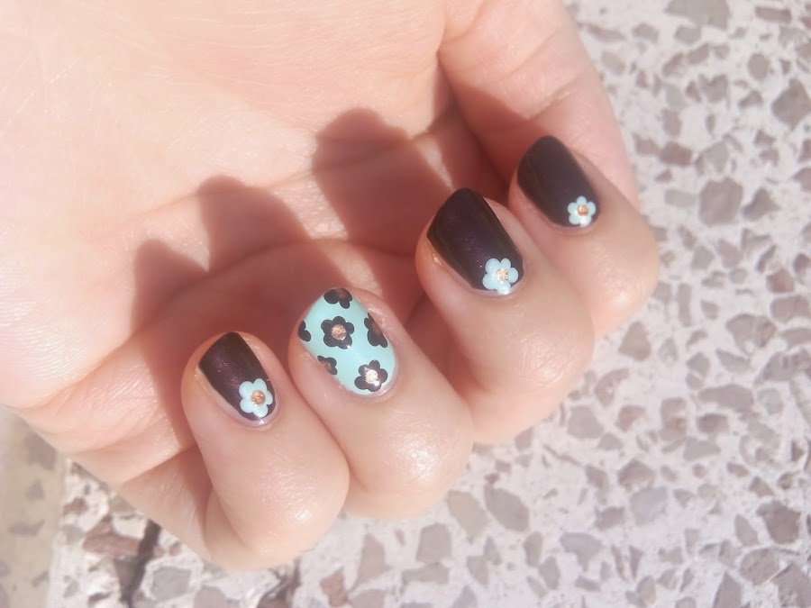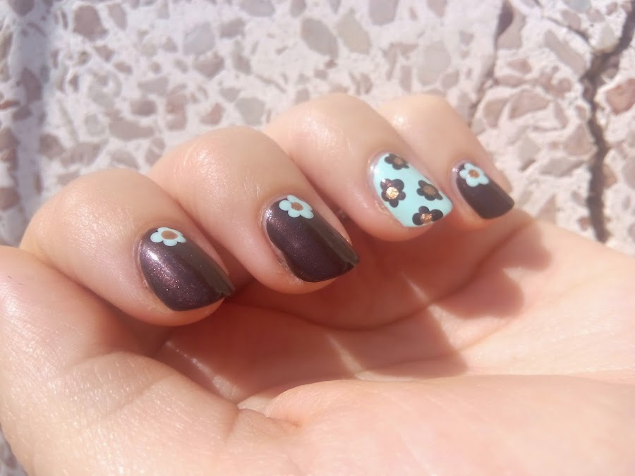 Aunque estemos en otoño, la calor se ha mantenido durante un tiempo, así que.... ¿por qué no unas florecillas en tus uñas? Yo he mezclado tonos otoñales, como lo son el marrón y el dorado, con un tono pastel, y este ha sido el resultado: