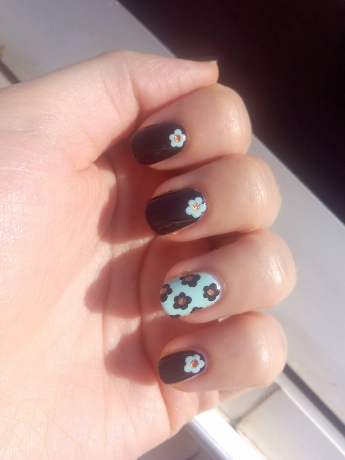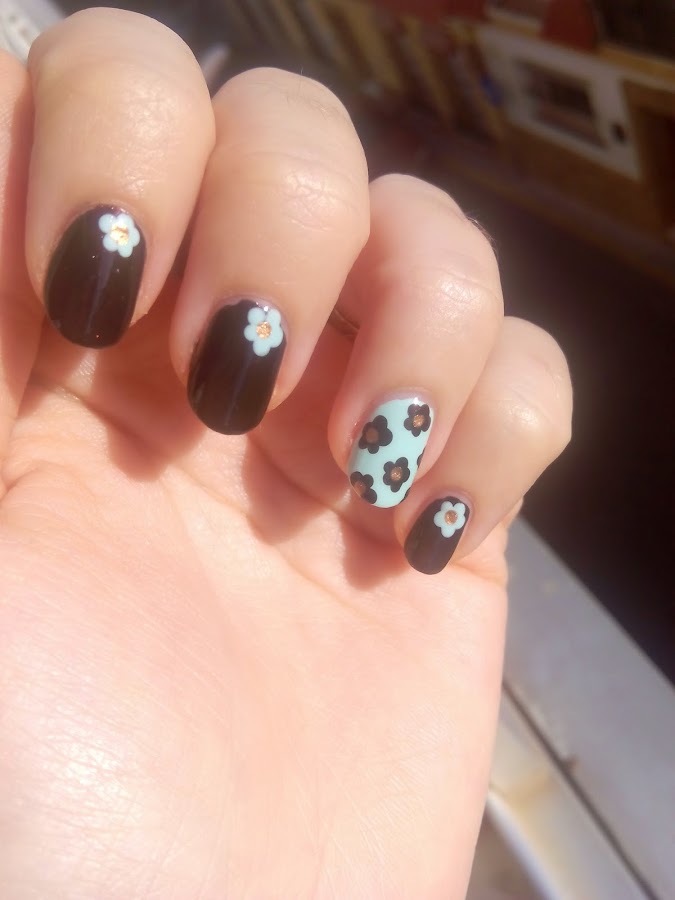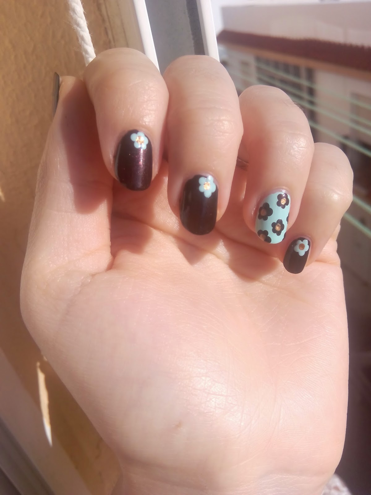 Aunque estemos en otoño, la calor se ha mantenido durante un tiempo, así que.... ¿por qué no unas florecillas en tus uñas? Yo he mezclado tonos otoñales, como lo son el marrón y el dorado, con un tono pastel, y este ha sido el resultado: