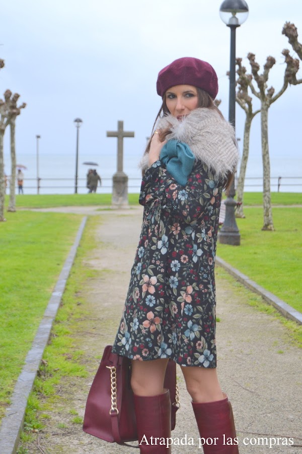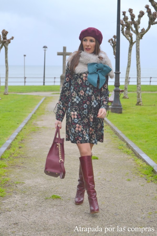Hoy os enseño un look de estilo romántico con un vestido de estampado floral y mangas acampanadas con un colorido perfecto para esta época de invierno. Lo combiné jugando con los colores del vestido con unas botas granates a juego con la boina y el bolso y con lo que es sin duda el complemento estrella del look y el complemento perfecto para estos días de frío (encima llevaba un abrigo pero lo quité para las fotos), un cuello de pelo con un enorme lazo en azul petróleo agua que ya os había enseñado en otro look de LE CHAT ERRANT DE LITT.