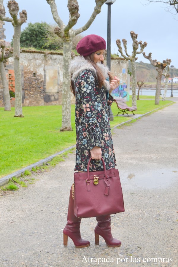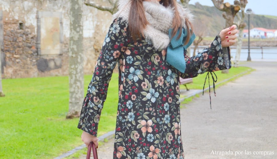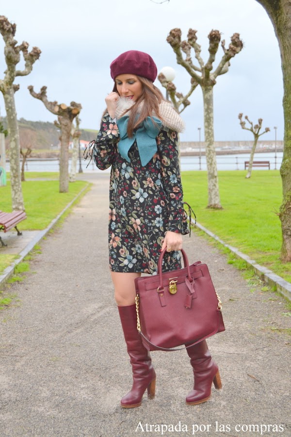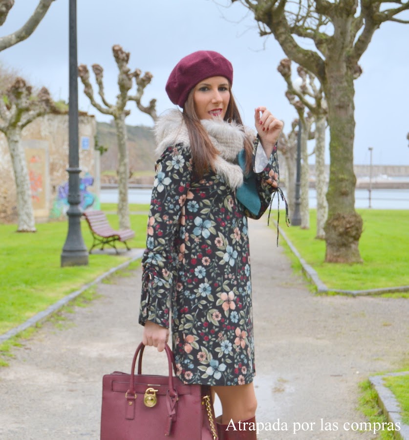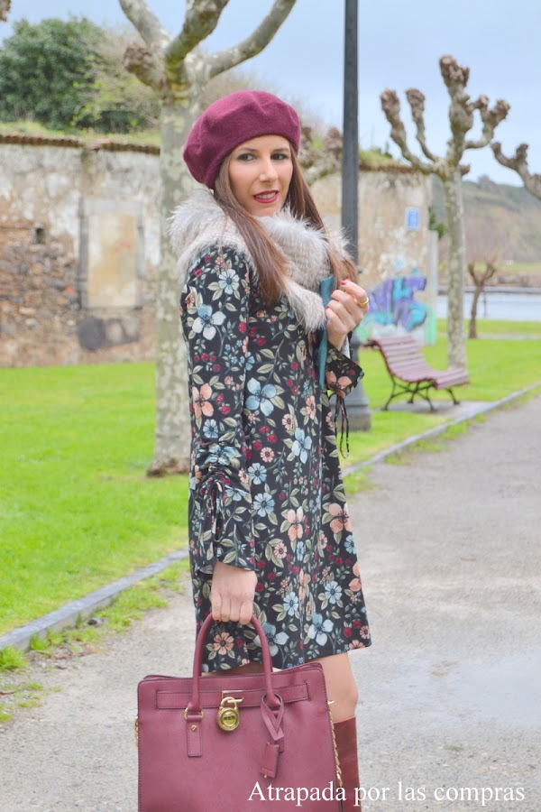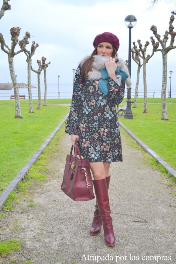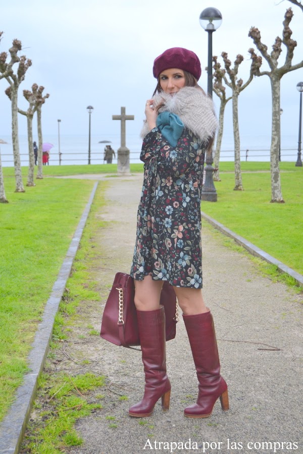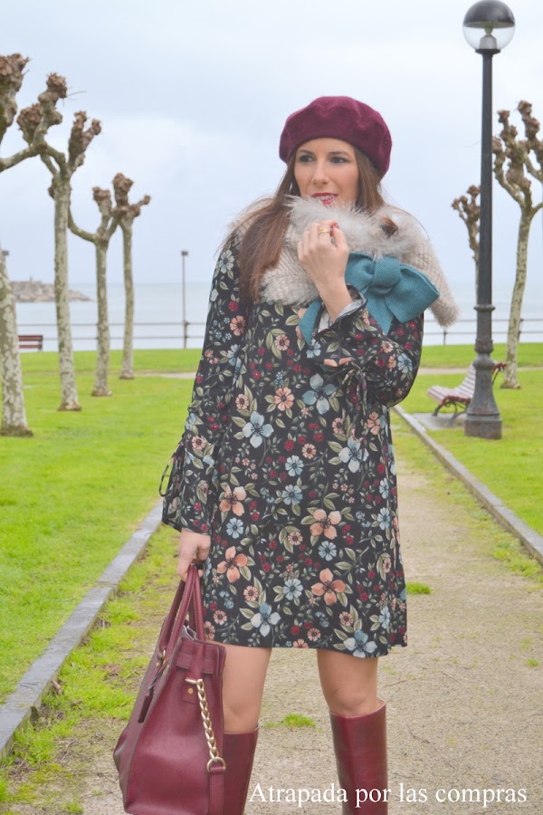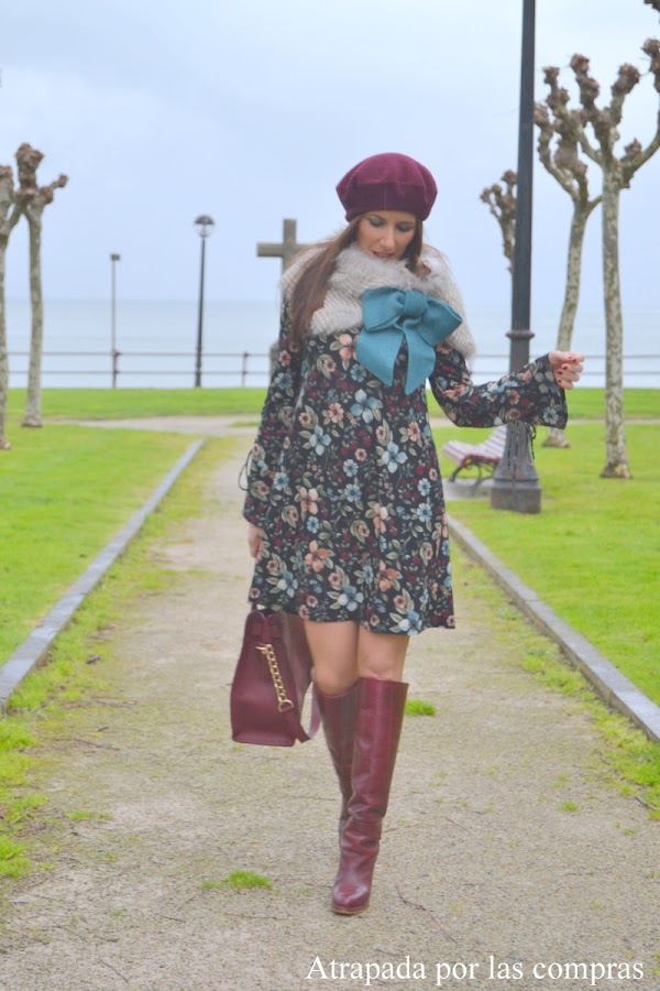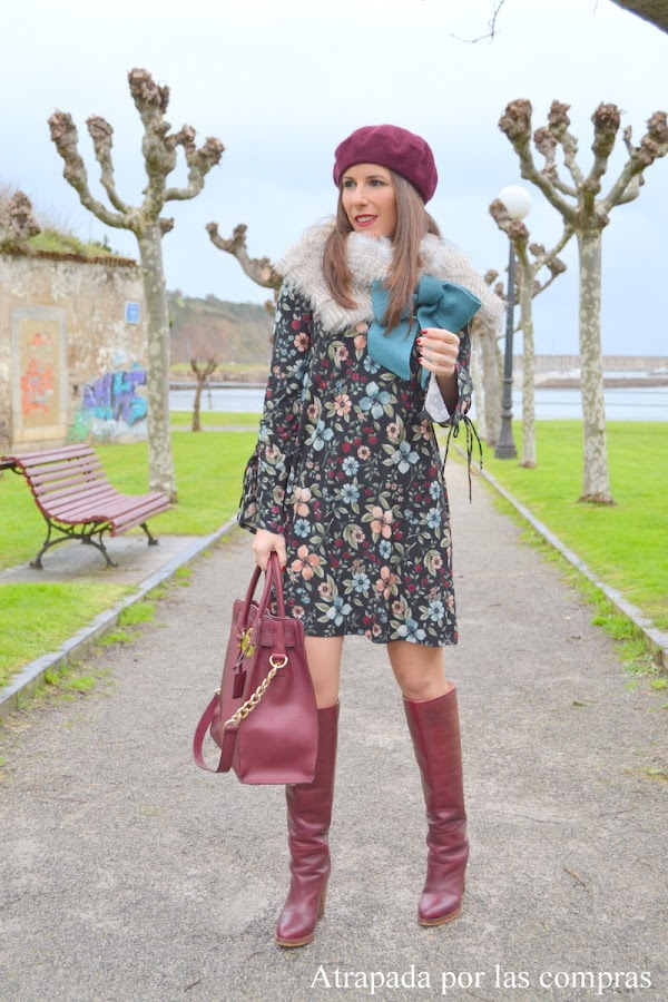 Hoy os enseño un look de estilo romántico con un vestido de estampado floral y mangas acampanadas con un colorido perfecto para esta época de invierno. Lo combiné jugando con los colores del vestido con unas botas granates a juego con la boina y el bolso y con lo que es sin duda el complemento estrella del look y el complemento perfecto para estos días de frío (encima llevaba un abrigo pero lo quité para las fotos), un cuello de pelo con un enorme lazo en azul petróleo agua que ya os había enseñado en otro look de LE CHAT ERRANT DE LITT.