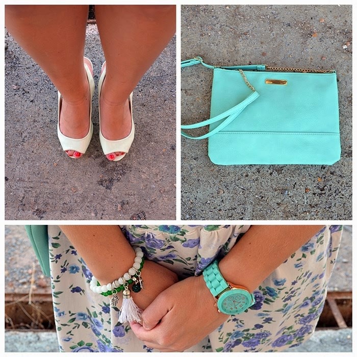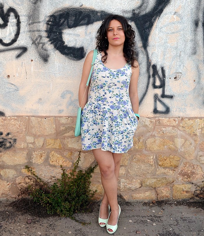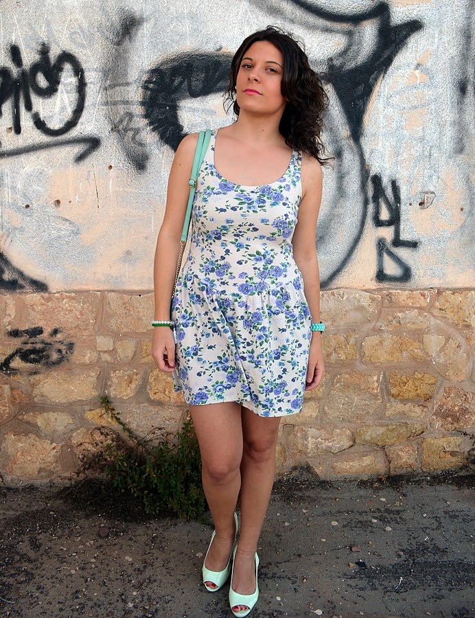 Holaa!! Hoy os enseño un vestido que probablemente os suene y tal vez alguna lo tenga. Me lo compré en Blanco hace cosa de 4 años, y mira por donde, este año se llevan las flores y en las tiendas se venden modelos muy similares a este, así que, por qué no utilizarlo? Me gusta por el estampado de las flores en tonos lilas y menta, pero lo mejor de todo es el detalle de la espalda. Me parece muy sexy y original. Como los detalles de las hojas de las flores son en verde claro decidí combinarlo con unos zapatos verdes pastel y un bolso menta. Además este vestido es cómodisimo porque lleva dos bolsillos y puedes meter varias cosas sin que se note.