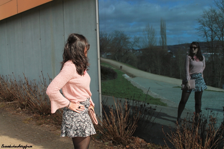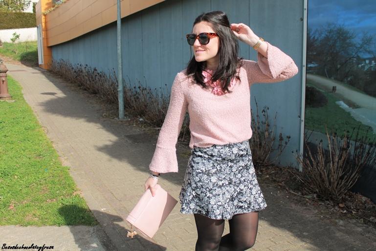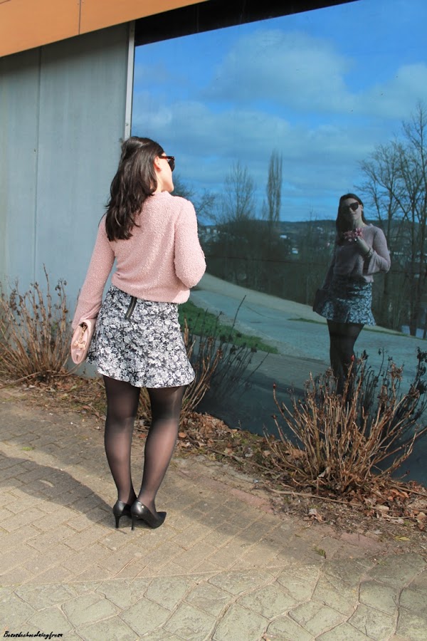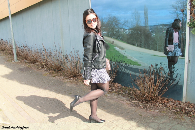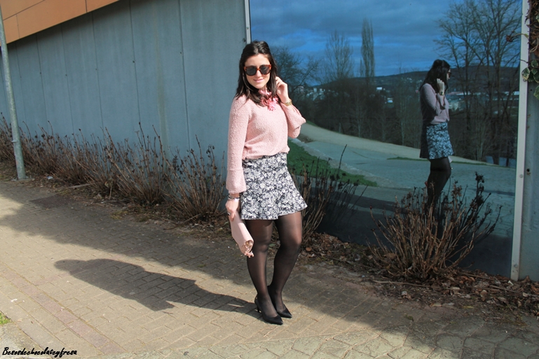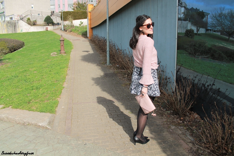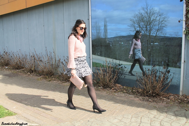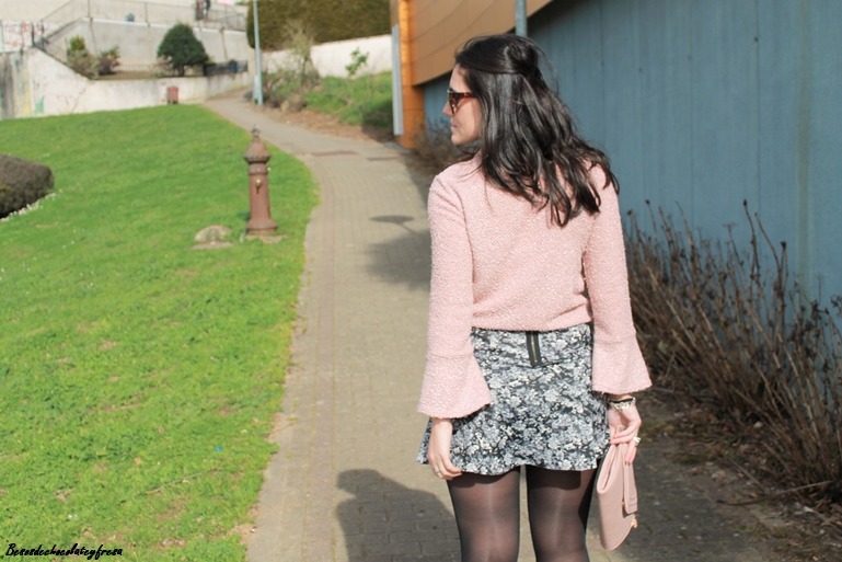 Completo el look con una falda de neopreno y estampado de flores en tonos negros y grises que creo que combinan a la perfección con el rosa empolvado, stilettos, clutch en el mismo tono del sweater, biker y mi nuevo maxi-collar de flores que recibí esta semana.