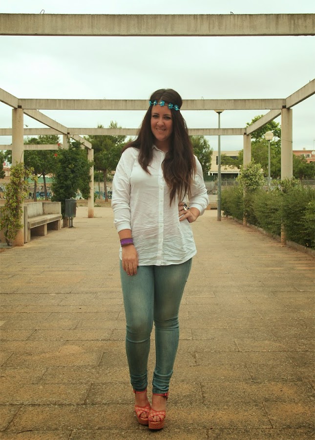 Good morning and happy friday! Today I will show you a new look with basic clothes like jeans and a white shirt but I added some details that make it special. The flower diadem and one of my favorite sandals provide the colour touch that it needs. The white shirt is essential in all closets, the bad thing about this shirt is that it wrinkles just by looking... Do you like this combination?