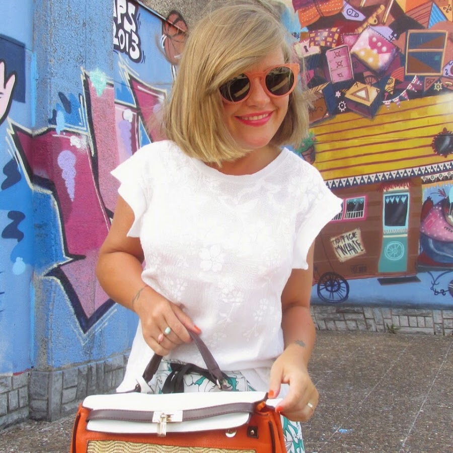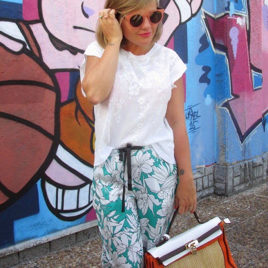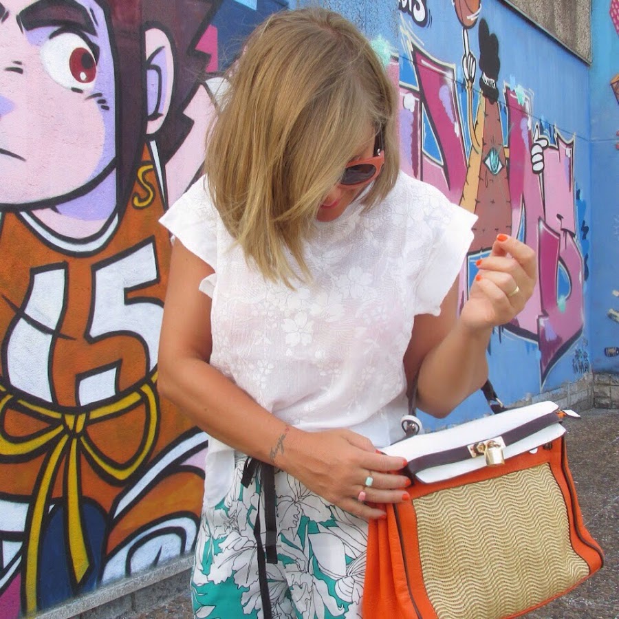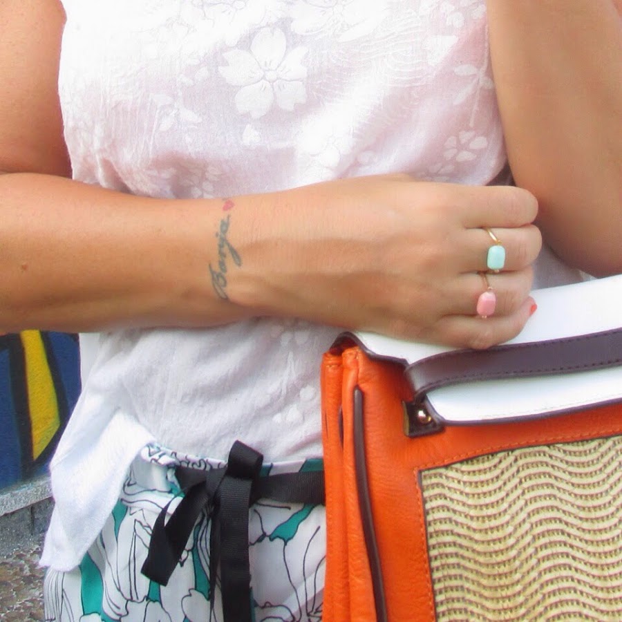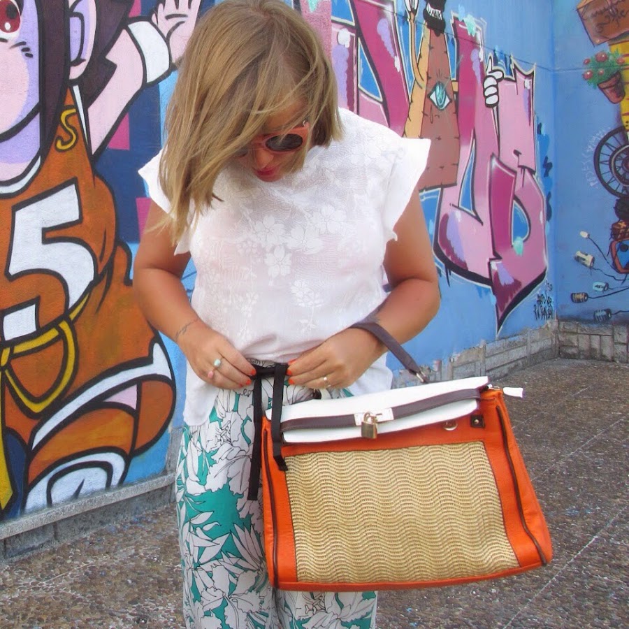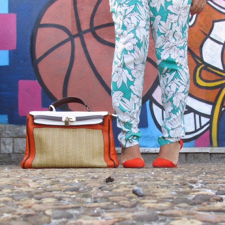 No se a vosotros, pero a mi me pareció una opción perfecta combinar el estampado de éstos pantalones con complementos naranjas, creo que le dan un punto de alegría y originalidad.