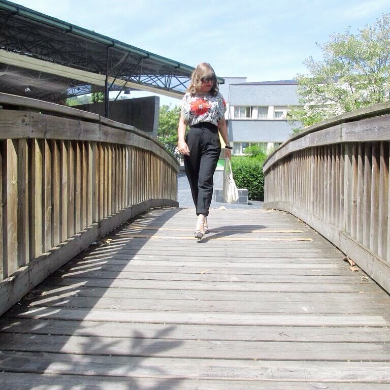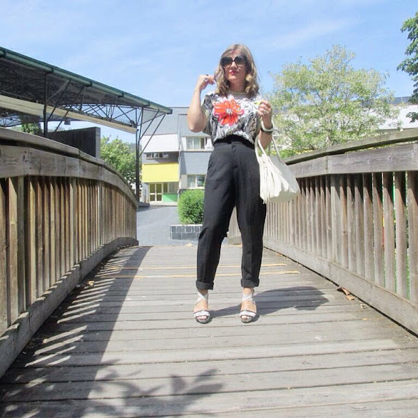 Decidí ponerme esta camiseta tan alegre pero como aún no me atrevo con looks muy veraniegos la combiné con pantalón negro y sandalias negras y blancas.