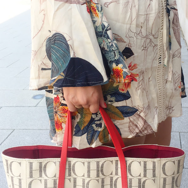 Para combinarlo he utilizado un shopper de Carolina Herrera clásico en tonos beige y rojos, con sandalias de Clarks a juego, de charol y madera, también rojas. Las gafas de sol son de Prada.
