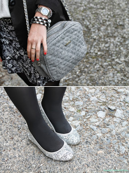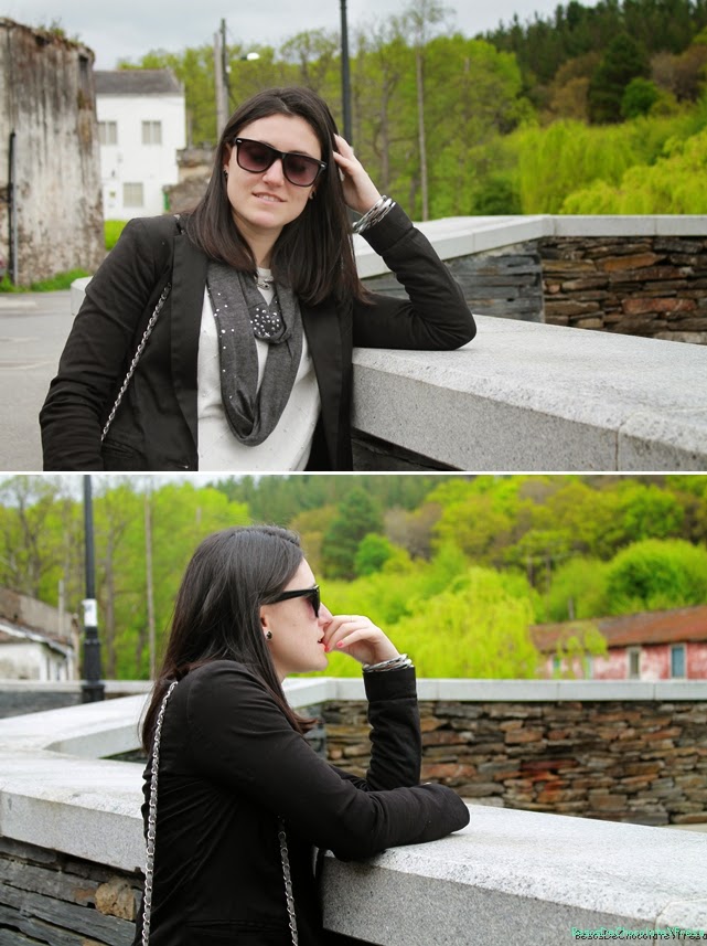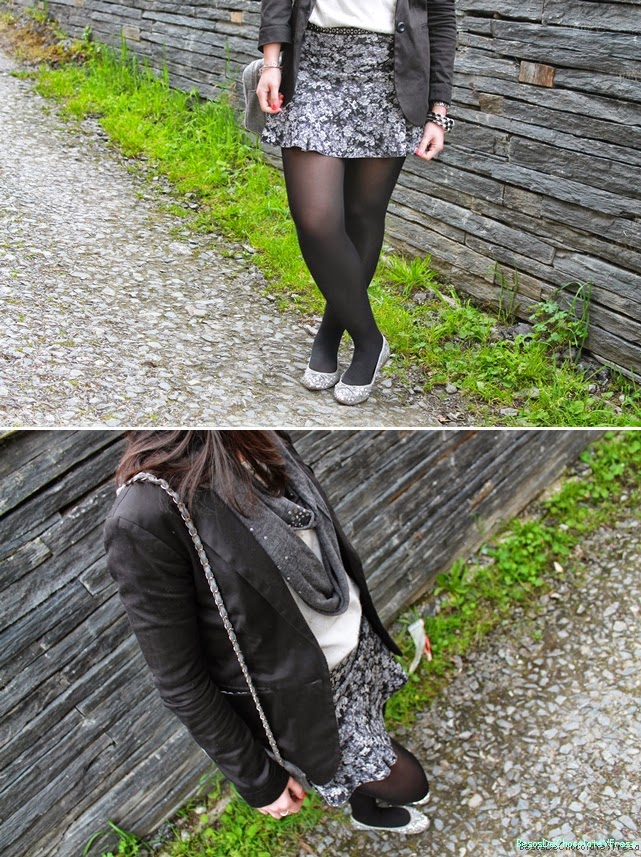 La combiné con sweater blanco de perlas, blazer negra. Como complementos bailarinas de brillos y bolso de tela y cadena en gris a juego con el fular de tachuelas.