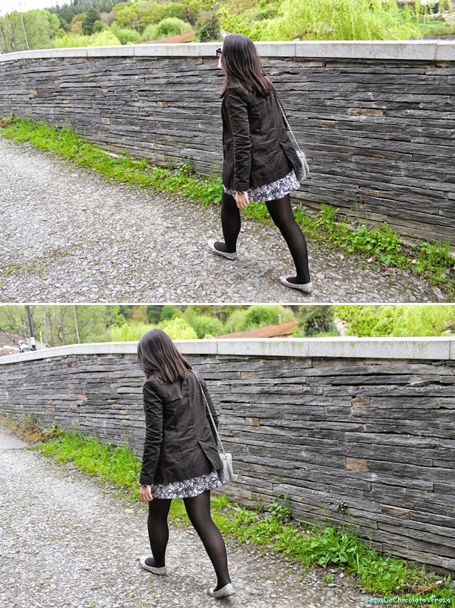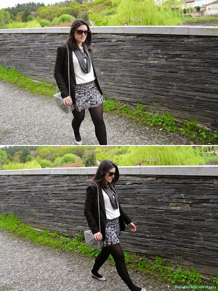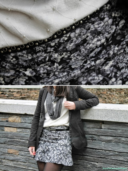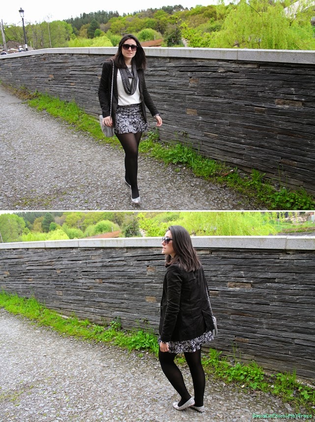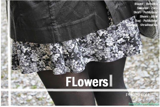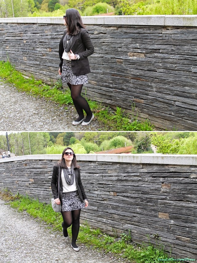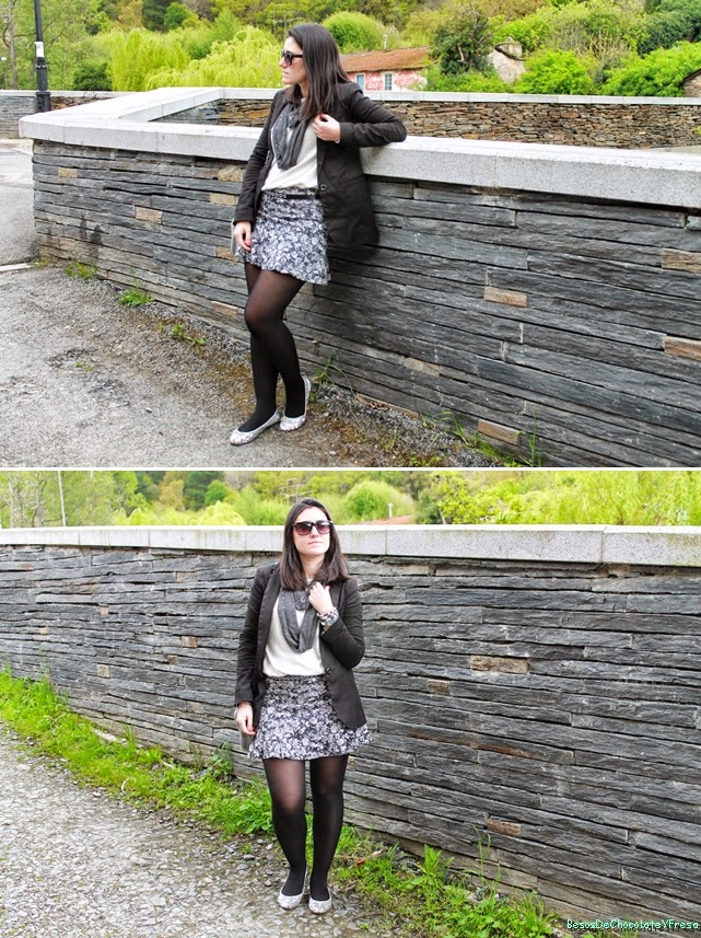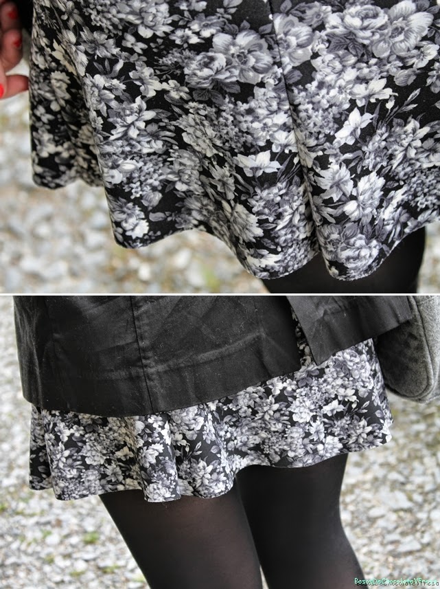 En cuanto al outfit de hoy os enseño mi nueva falda de flores en tonos grises y negros de neopreno y con vuelo, super cómoda apta para poner con medias para días algo revueltos como sin medias para dias más calurosos.