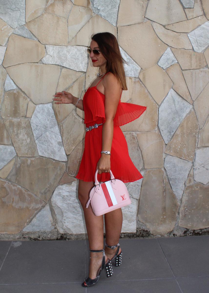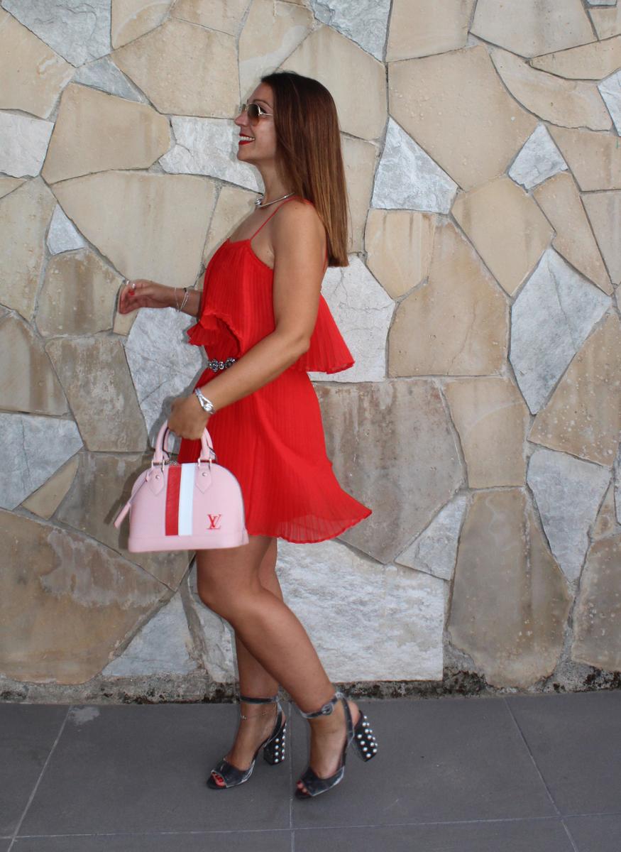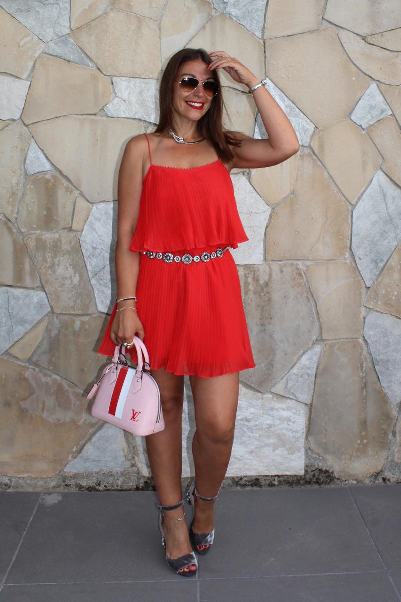 El vestido compuesto por dos capas, la del busto y la falda, en tela muy vaporosa y plisada. Aprovechando que la prenda tiene la cintura tan marcada debido al cambio de telas, le añadí un cinturón tipo joya para aún así marcarlo más. Y como la cosa iba de joyas, sandalias adornadas con esas pequeñitas joyas blancas que tanto me gustan.