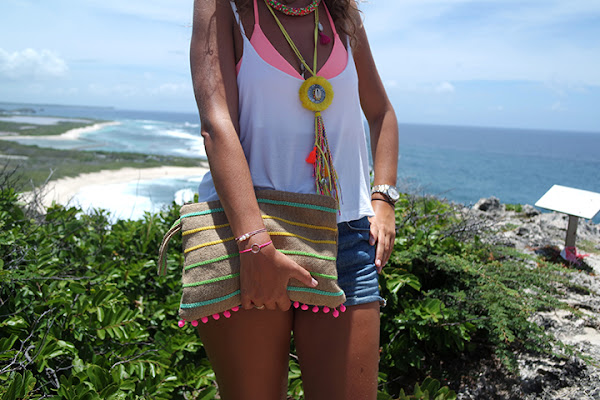 En tu armario de verano si algo no puede faltar son estos básicos: un pantalón corto vaquero y una camiseta blanca de tirantes, según los accesorios con los que los mezcles podrás terner cientos de looks diferentes.En esta ocasión aposte por collares en tonos fluors, un canotier, mis inseparables gafas con cristal espejo y un bolso de mano super colorido diseñado por mi.