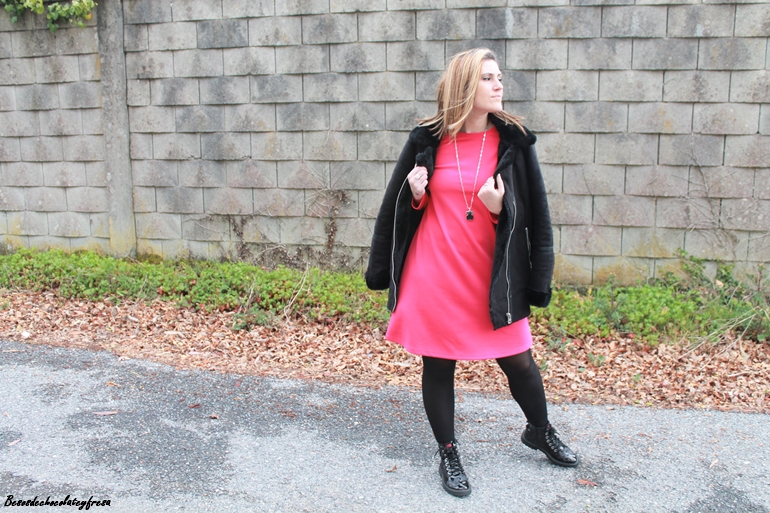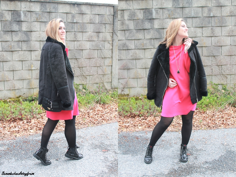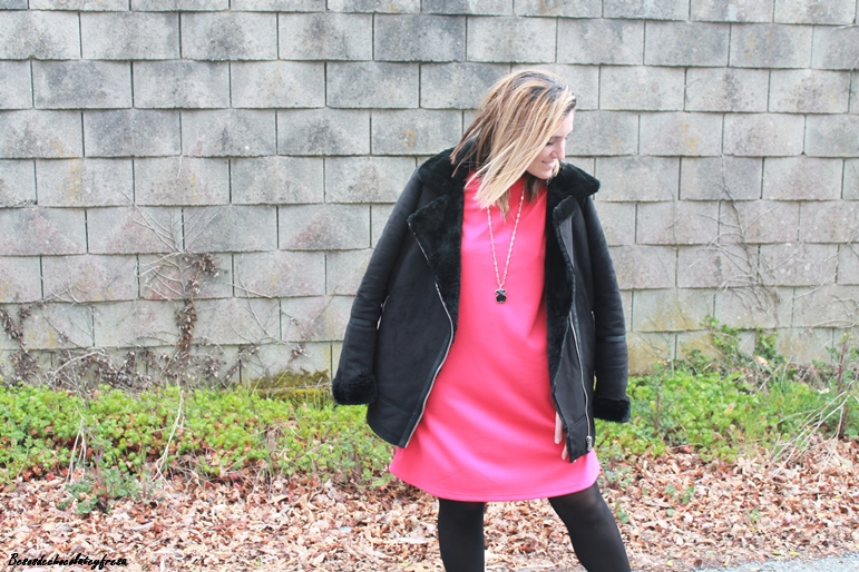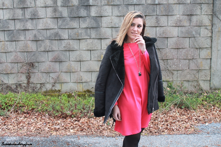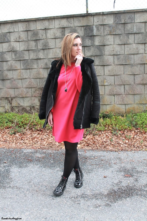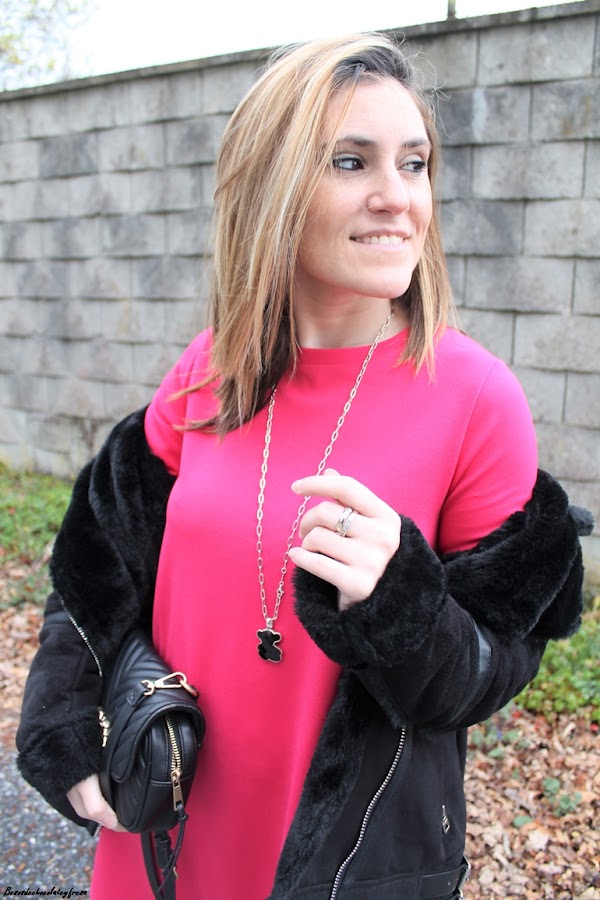 En el look de hoy os traigo un vestido en color llamativo, rosa fucsia super chillon sencillo pero que solo el color le da mucha fuerza y consistencia al outfit. Complementos en negro y como el frío está presente de nuevo, cazadora de ante y peluche, botines y bolso negros.