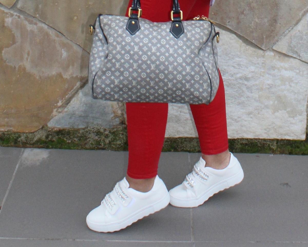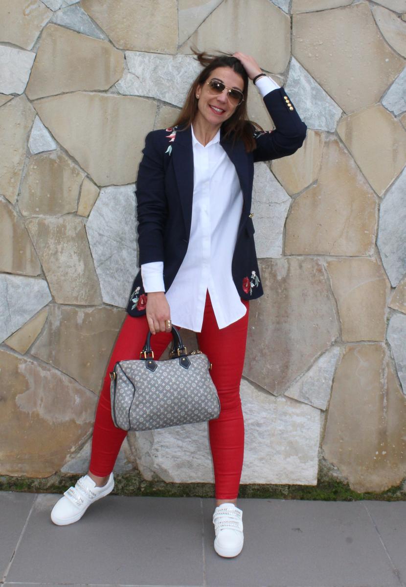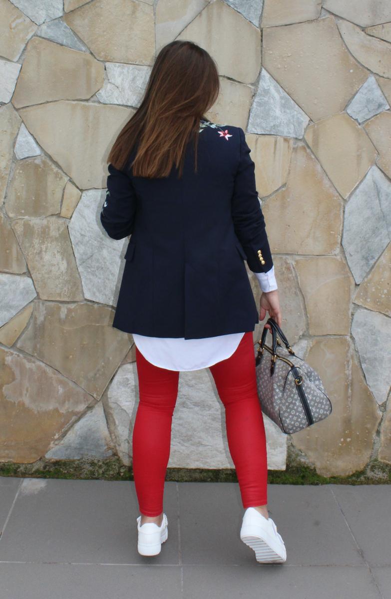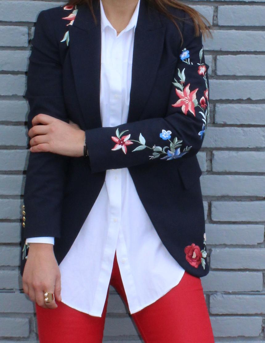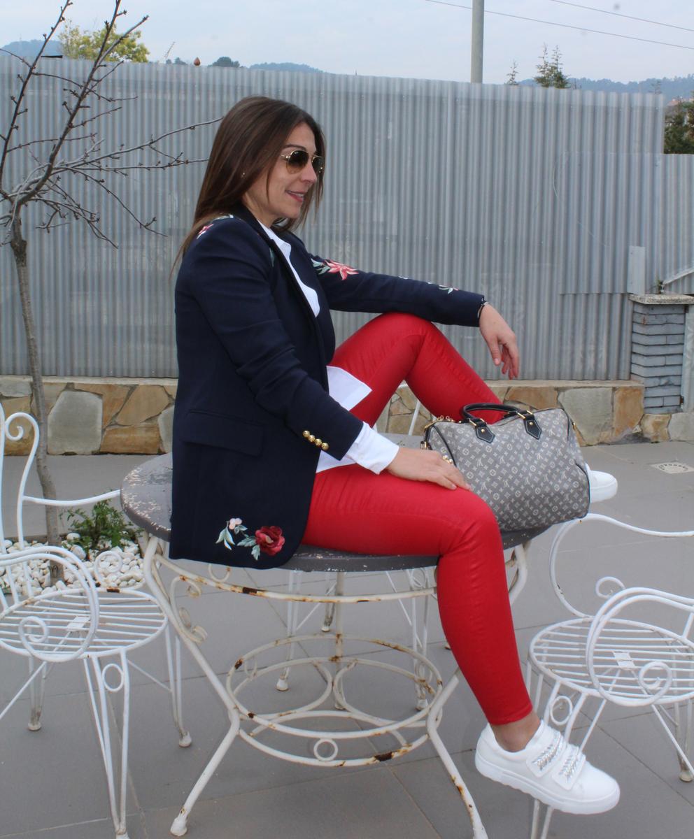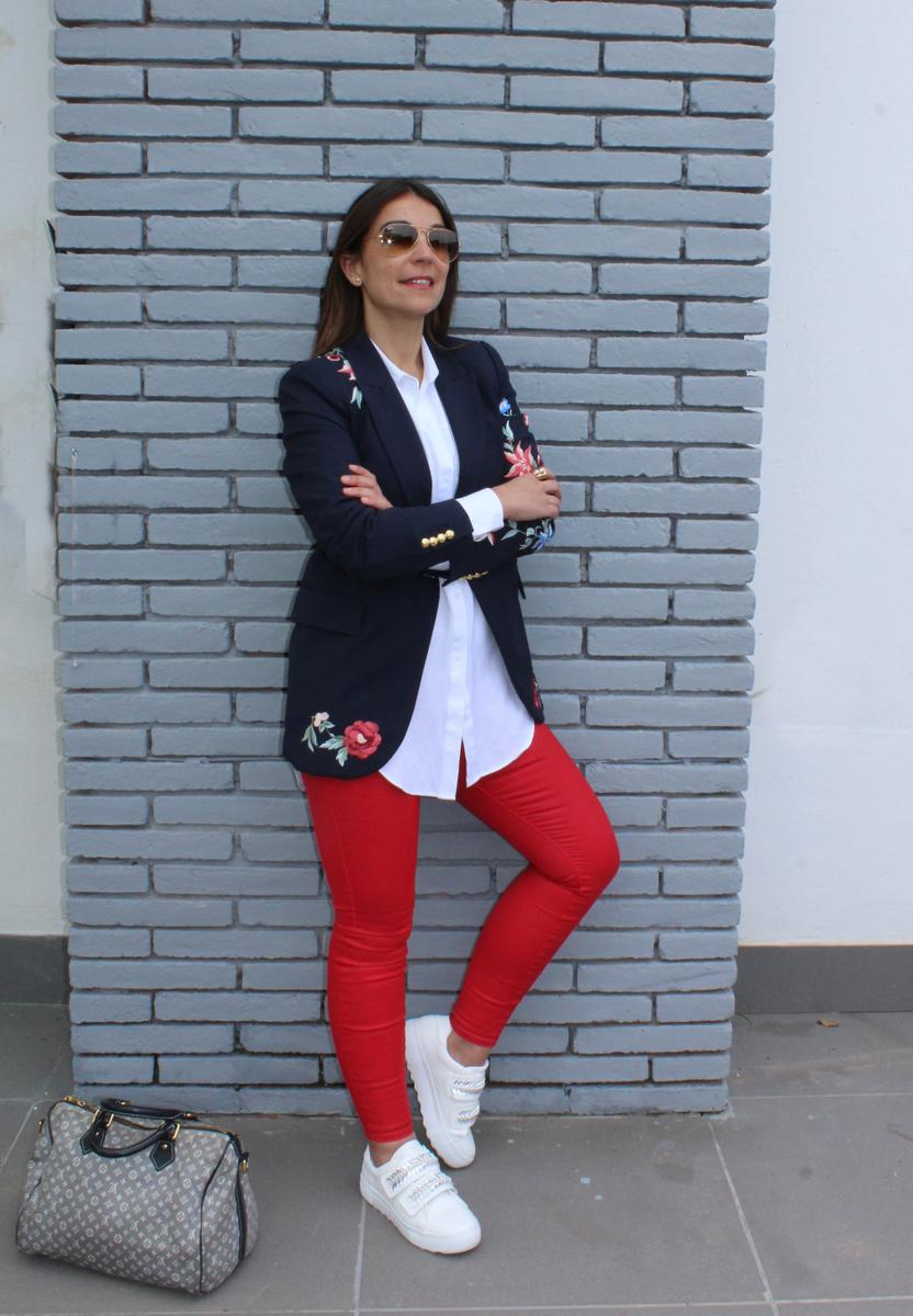 Como os decía, un look compuesto por una americana con flores bordadas ( lo reconozco, son mi debilidad), pantalones pitillo ajustados en color rojo, una camisa oversize, para rebajar el efecto formal de la americana y unas zapatillas adornadas con predería y perlas, el resultado, para mi, uno de los looks más cómodos y resultones para una jornada dura de trabajo, sin perder ni un ápice de estilo.